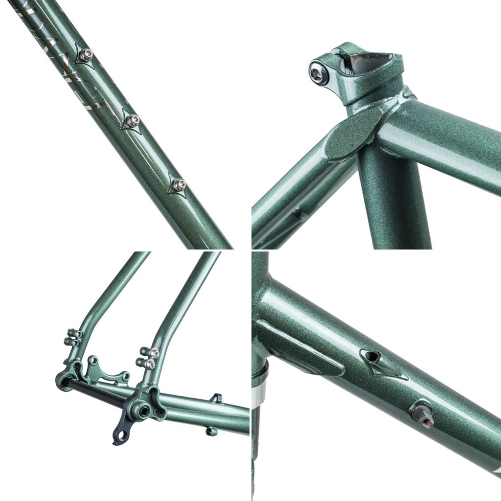 フォーク横/ダウンチューブ裏等、現代のグラベルアドベンチャーと同レベルの豊富なアイレットが備わっており、前後キャリア/フェンダーの重装備から、バイクパッキング+ユーティリティケージの様なライトなツーリングスタイルにも対応してくれます。