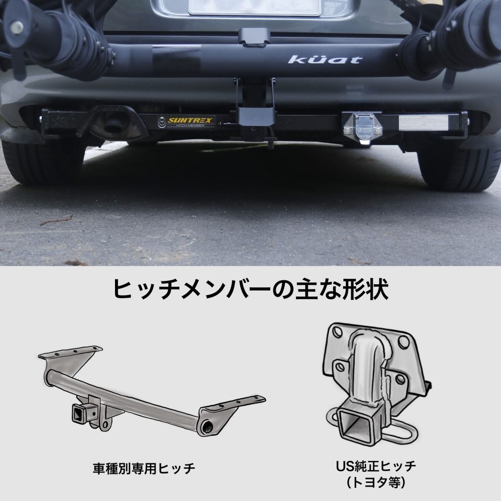 KUATのヒッチラックを取り付ける車には、2インチ or 1インチ角サイズのヒッチメンバー(トレーラーやボート等を牽引する為の専用部品)が必要になります。ヒッチメンバーはボルトで固定される部品(指定部品扱い)なので、車両の改造・構造変更等の手続きは必要なく車検も問題ありません。ヒッチメンバーは車の種類により適合(互換性)が様々(場合によりクルマ側の加工が必要)、施工費用も場合により数万円程かかる為、欲しいラックが決まれば 先ずは自動車整備工場にてご相談頂く事をオススメします。