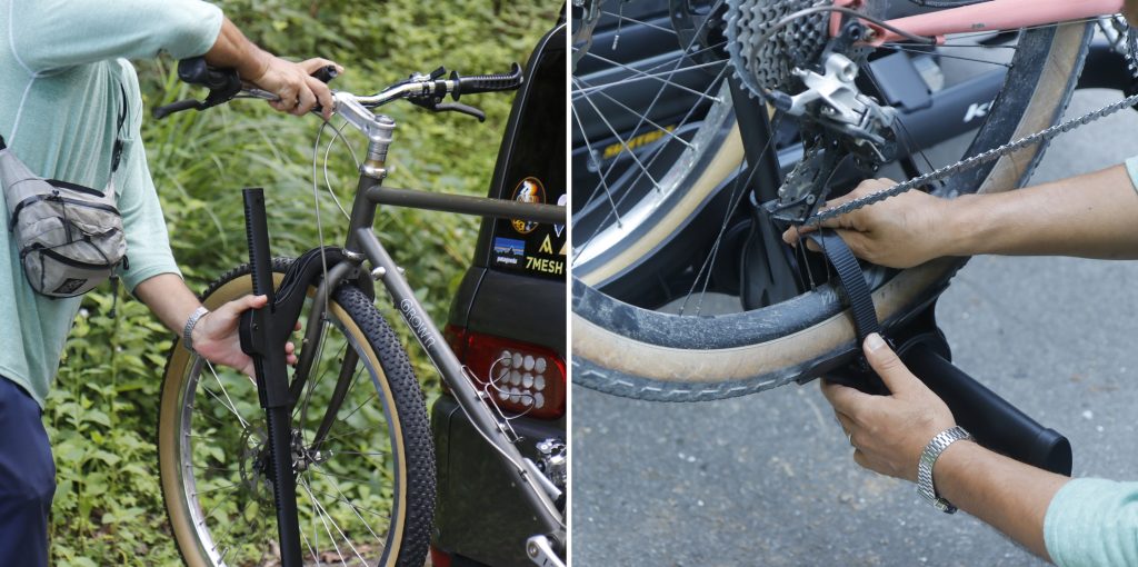足元にあるレバーを押しラック本体を展開したら、前輪固定用アームレバーを広げ、前後ホイールをトレーに載せ、前輪はアームを押し下げて固定&後輪はストラップで固定するだけでOK。