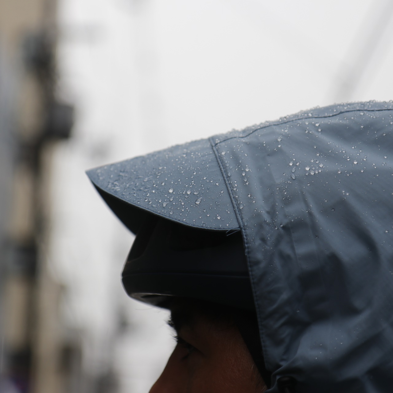 ヘルメットの上から被っても下に被ってもOKな絶妙なサイズで、ツバの長さも丁度よく、前方からの雨を防ぐと共に 後方確認のしやすさも実に良好です。