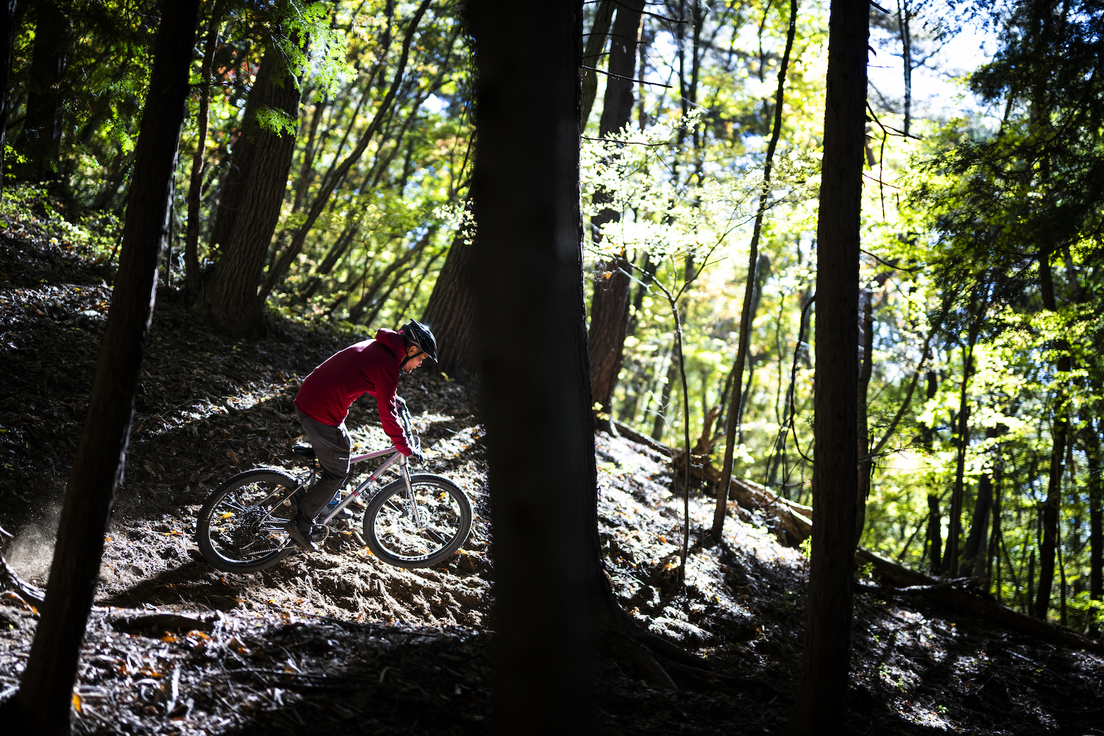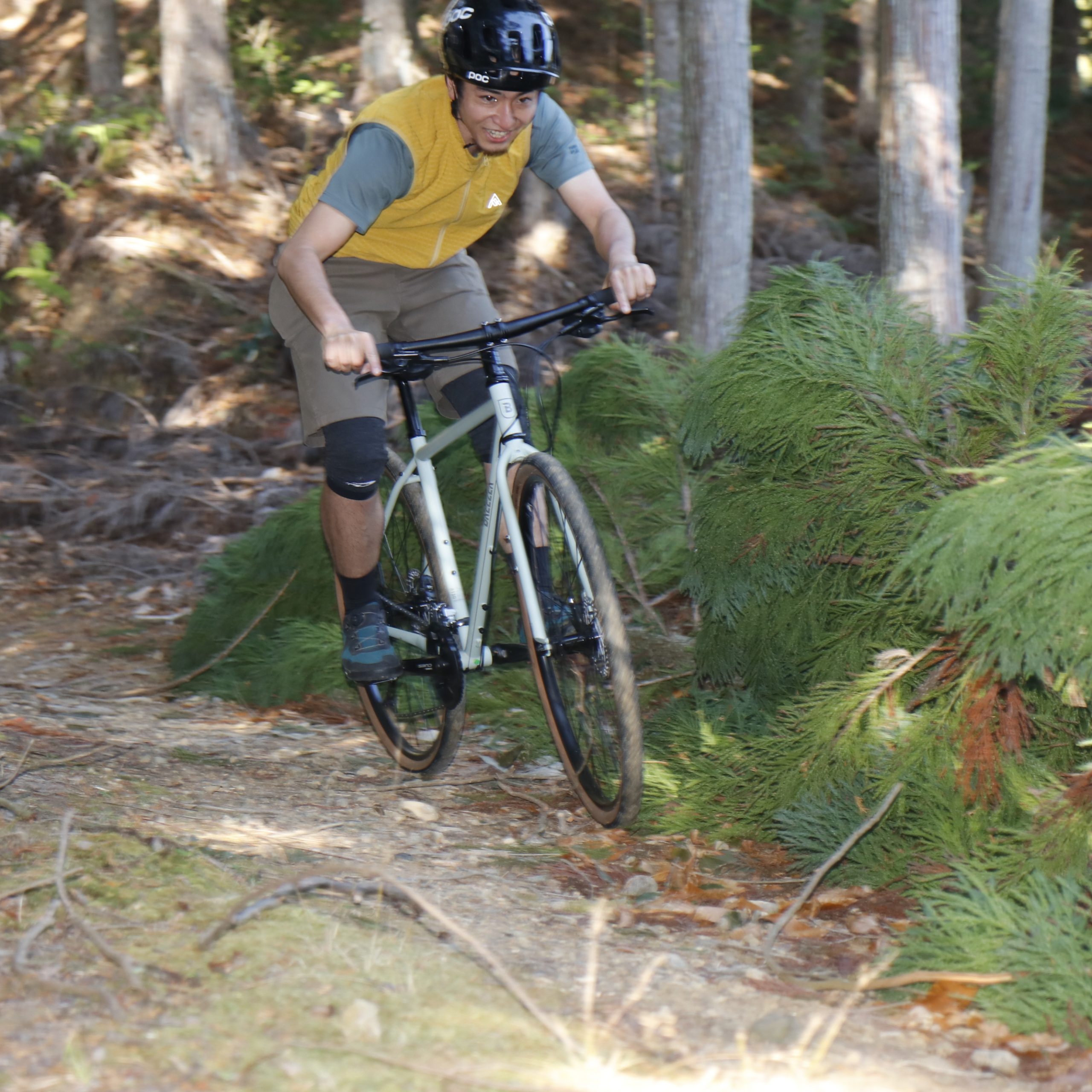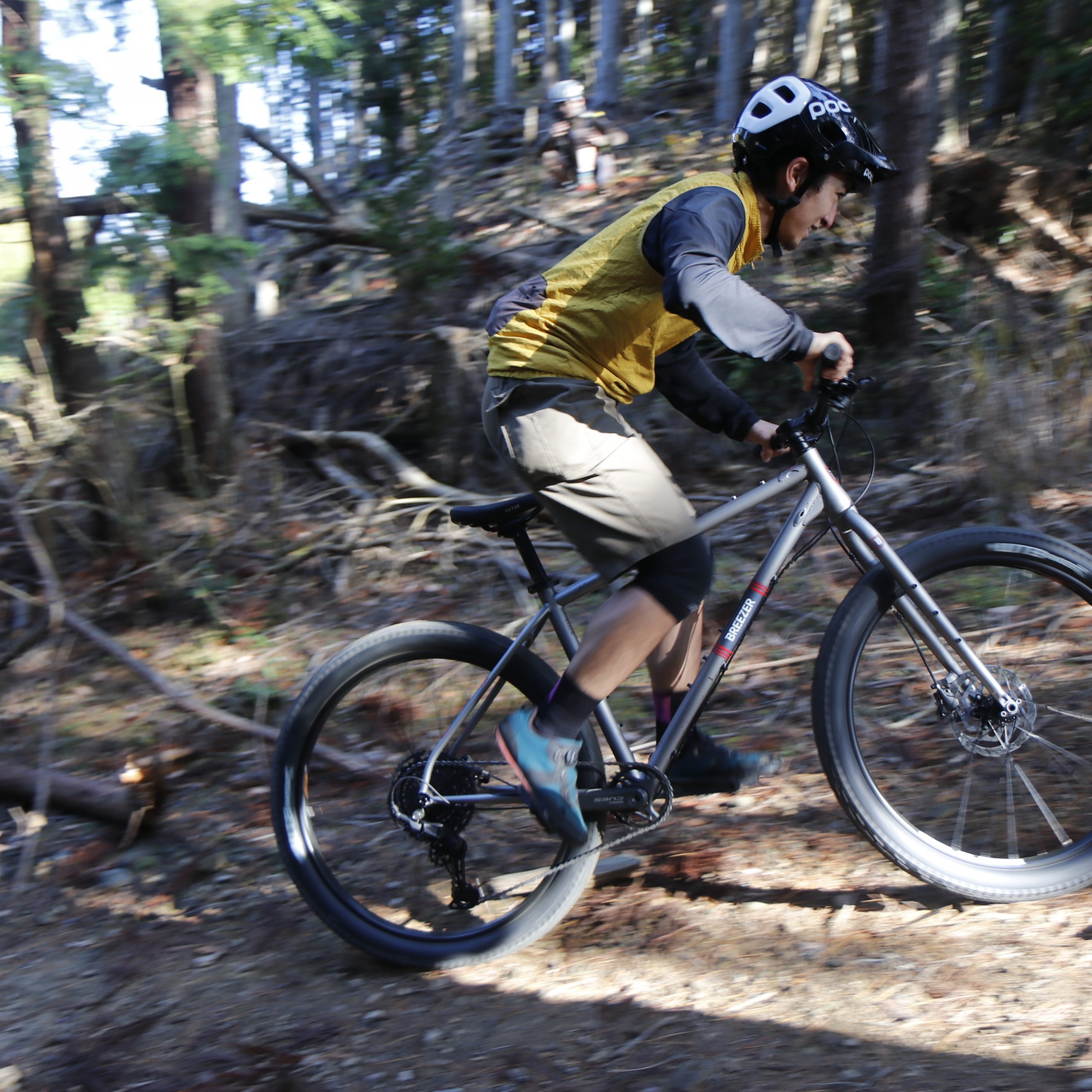 27.5X2.8″のセミファットタイヤによってグリップとサスペンション効果を得てタイトなシングルトラックを駆け抜ける。
