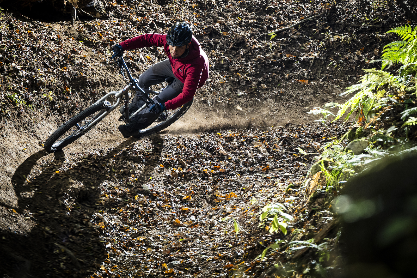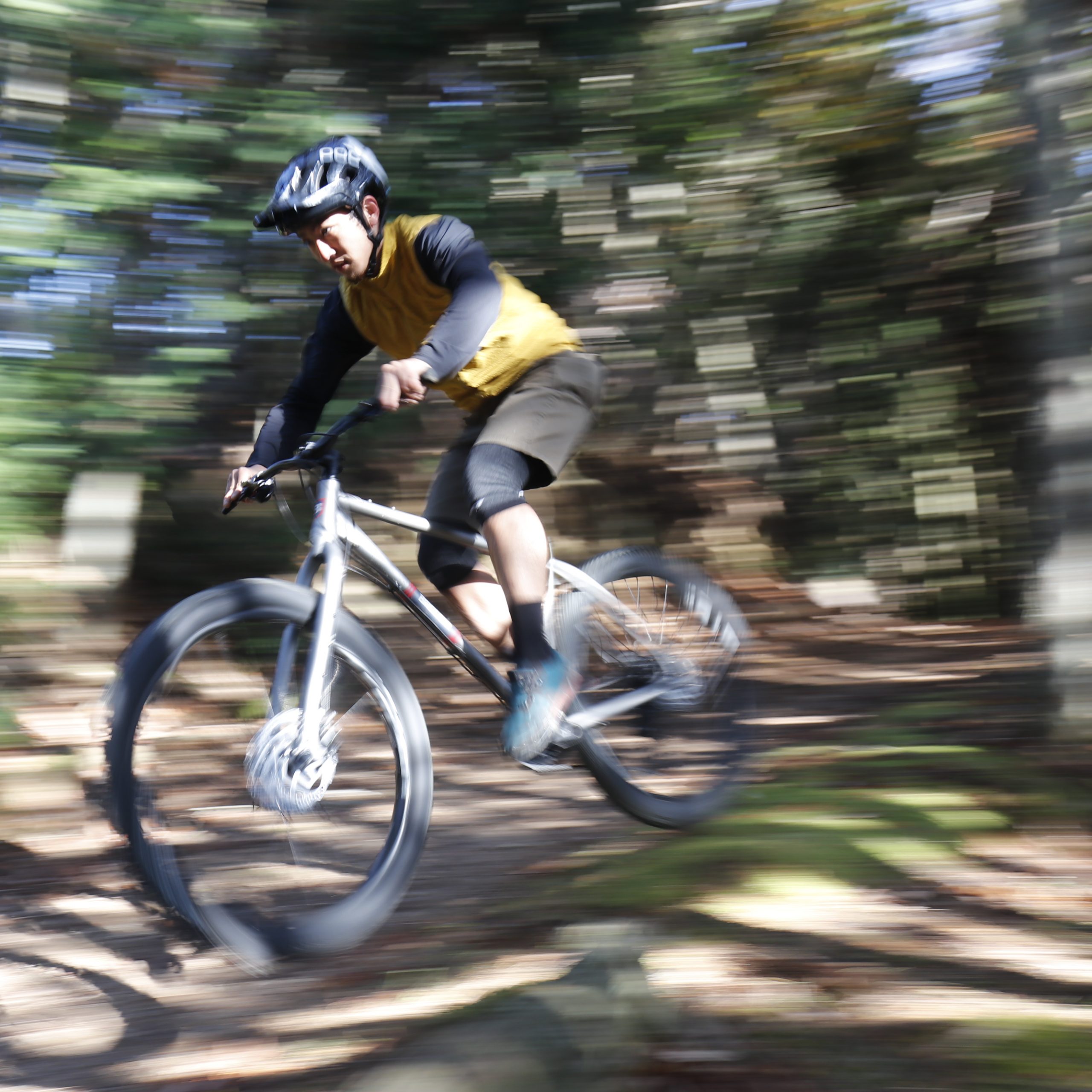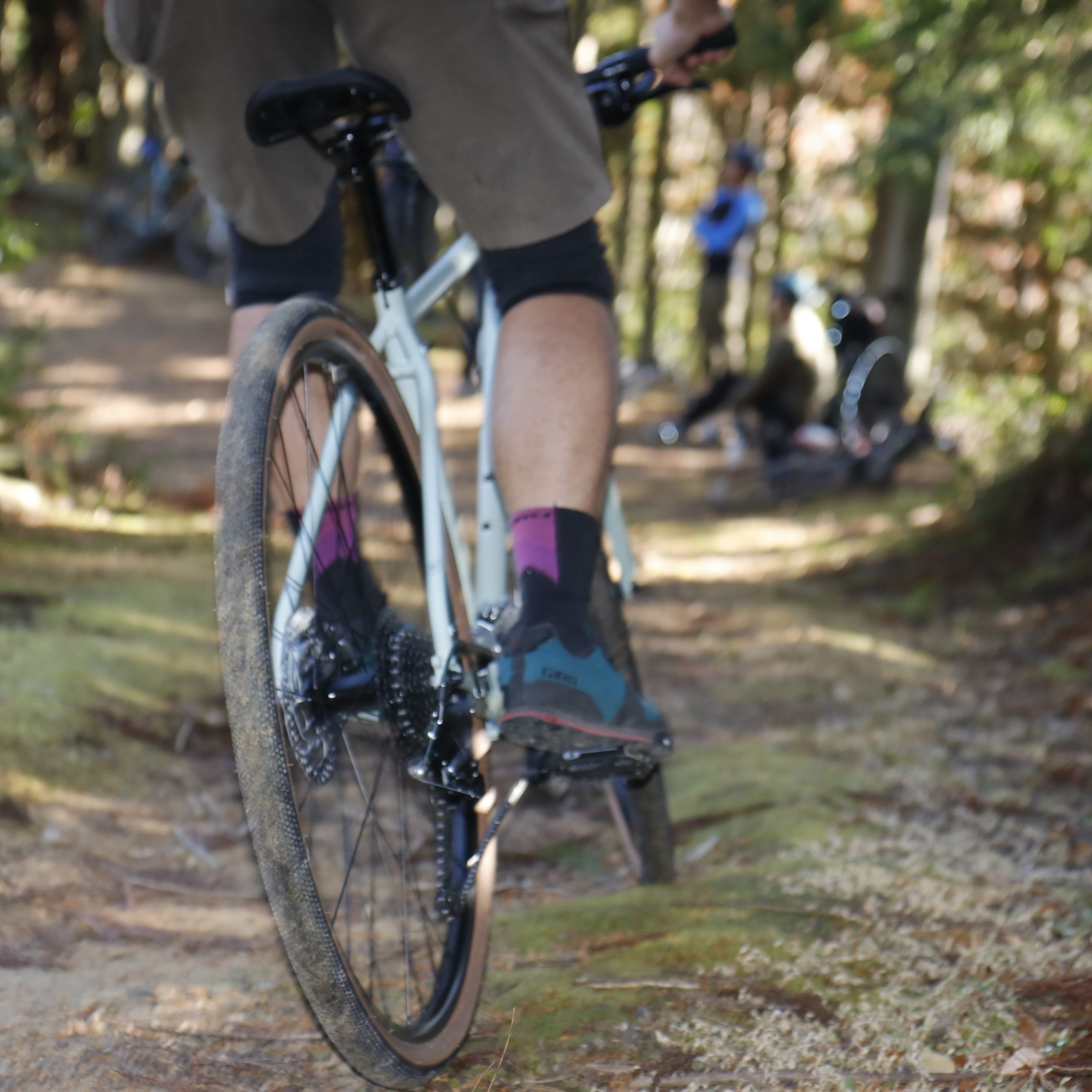 27.5X2.8″のセミファットタイヤによってグリップとサスペンション効果を得てタイトなシングルトラックを駆け抜ける。