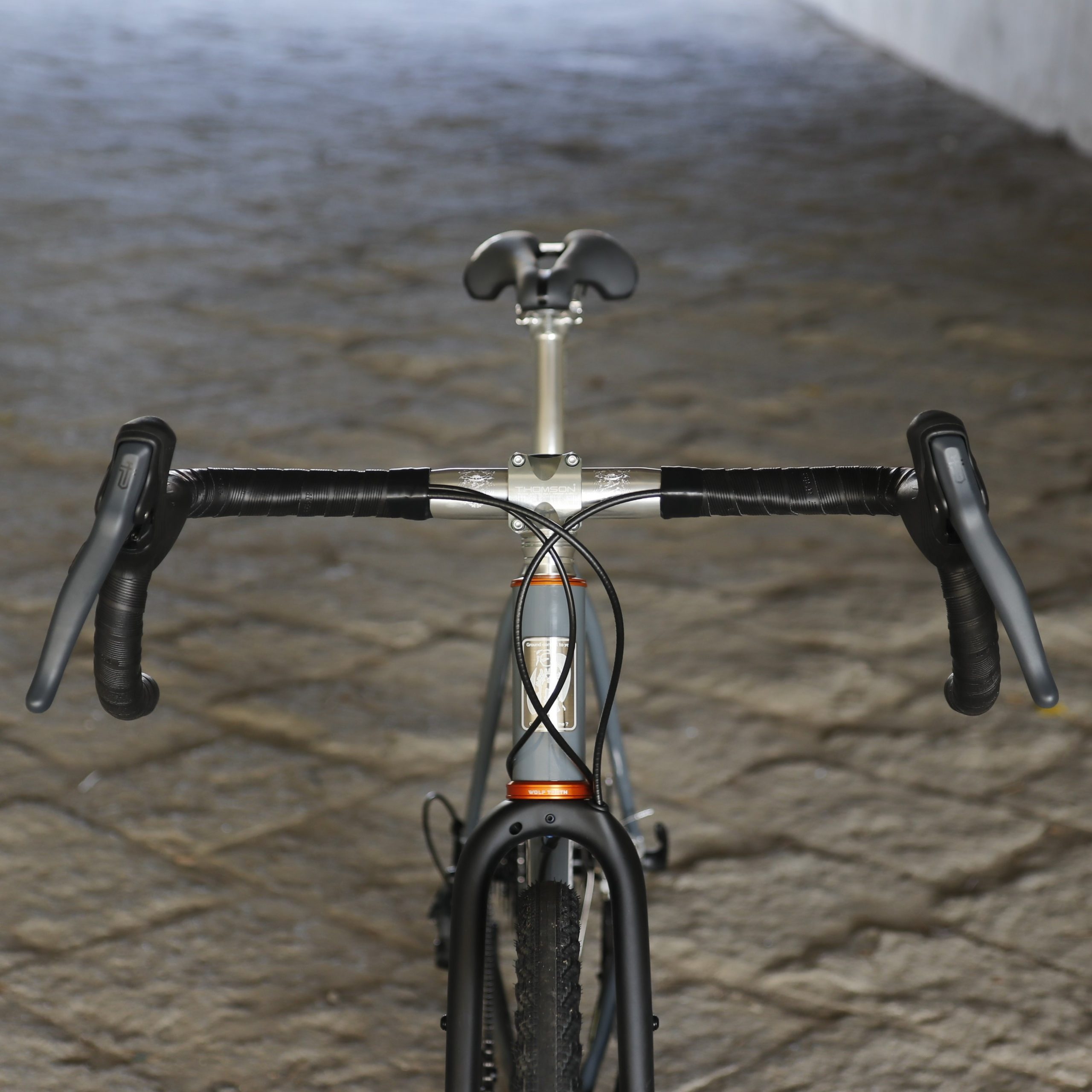 ホイールには、高速性~軽量性にふりきらず、1DAYライド~グラベルライド~ツーリングなど様々な用途性に使えるよう、 ハブに質実剛健なSHIMANO 105を+リムにVELOCITY社 AILERONをチョイス。スポークはシルバーでコックピットのシルバーカラー主に全体とのバランスをとりました。主張し過ぎずとも存在感あるAILERONロゴのフォントも良い感じですね。
