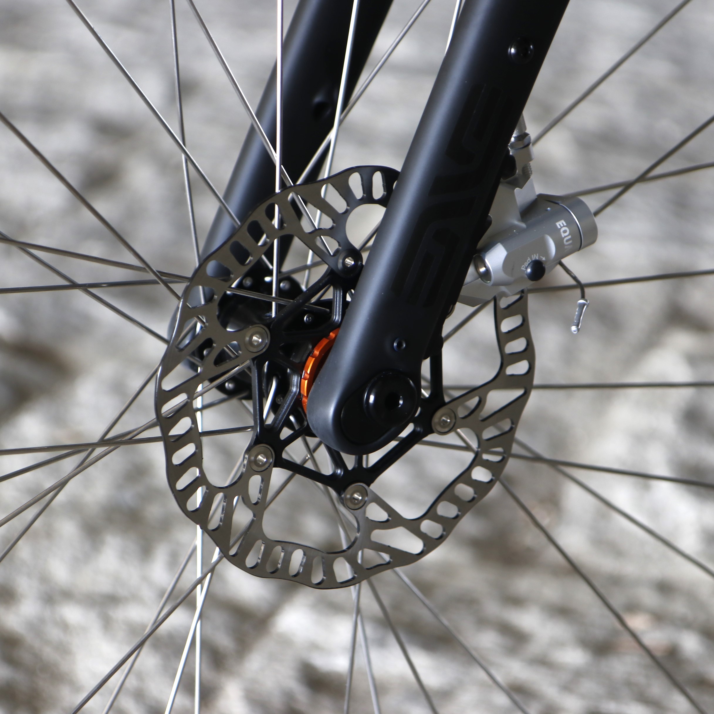 ブレーキローターにはモータースポーツを含め140もの世界タイトル獲得実績のあるイタリアのブレーキ専売ブランド BRAKING製 LIGHTWAVE CENTERLOCKをチョイス。WAVE形状を採用したローター。今でこそ当たり前に目にするこの形状はこのBRAKINGが世界初。ゴミを掻き出すセルフクリーニング効果があり、熱膨張による歪みにも強く、曲がりの出にくさからメンテナンス頻度を下げてくれます。ヘッドパーツ、シートクランプ同様 WOLFTOOTH製ロックリングのオレンジがカッコイイですね!。