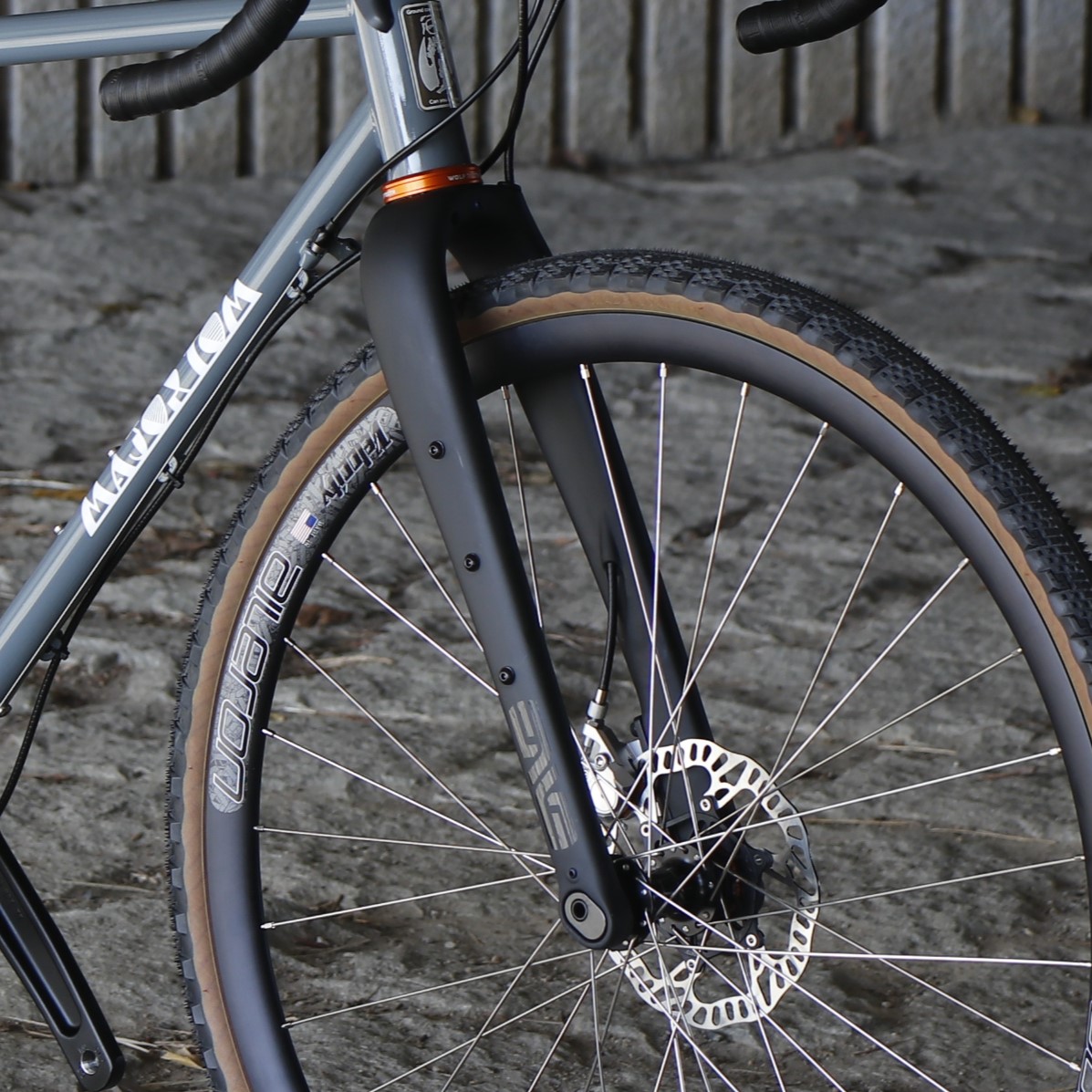 フロントフォークには、handmadeinUSAに拘り続ける世界最高峰のカーボンファイバー技術を要するエンジニア集団@envecomposites 製「ADVENTURE FORK 1.5 TAPER」が標準採用。