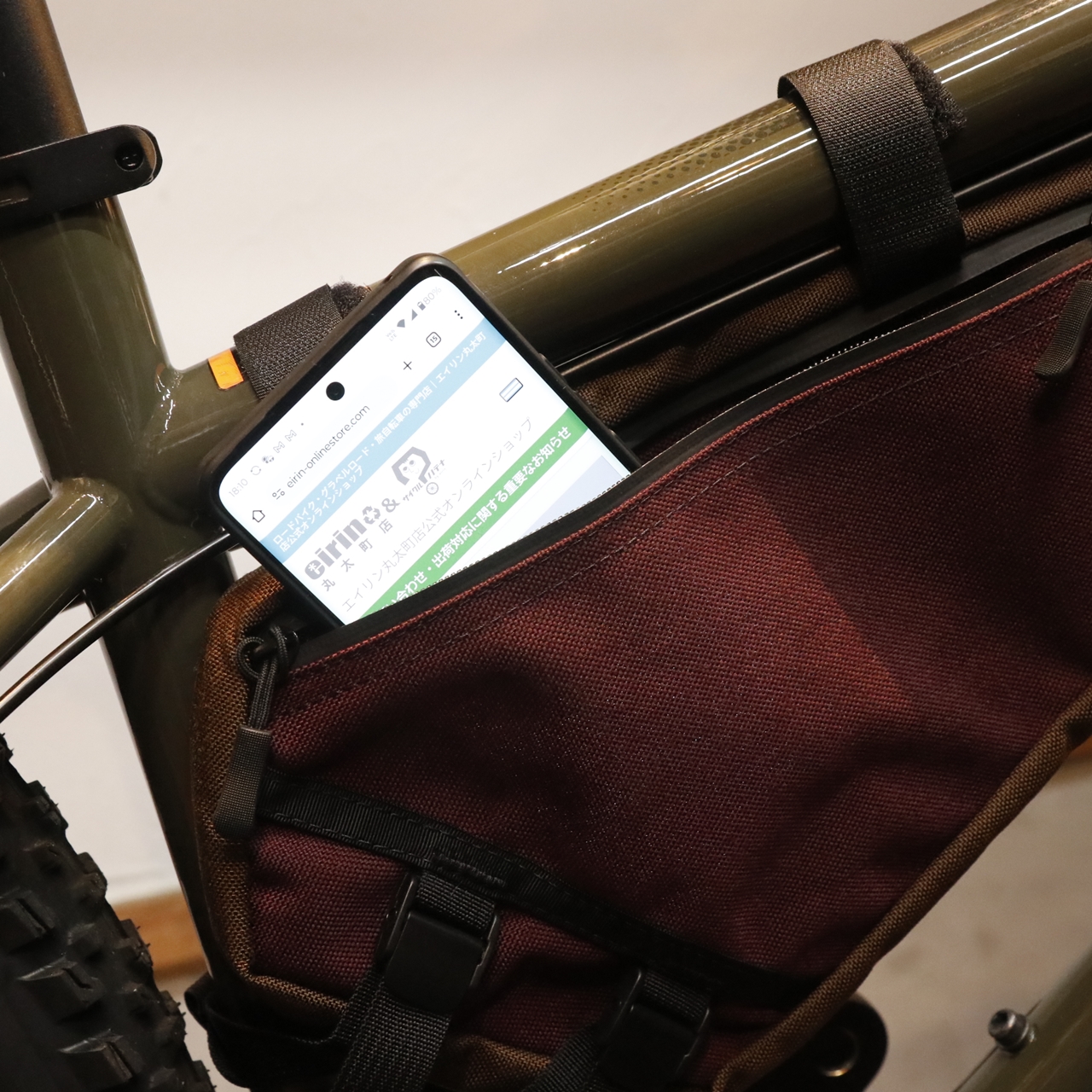 トップチューブとダウンチューブに装着するベーシックなフレームバッグは、メインの荷室と平面のポケットの両面で構成され、上部に設けられたジッパーはライド中でもバッグにアクセスがしやすくなっています。