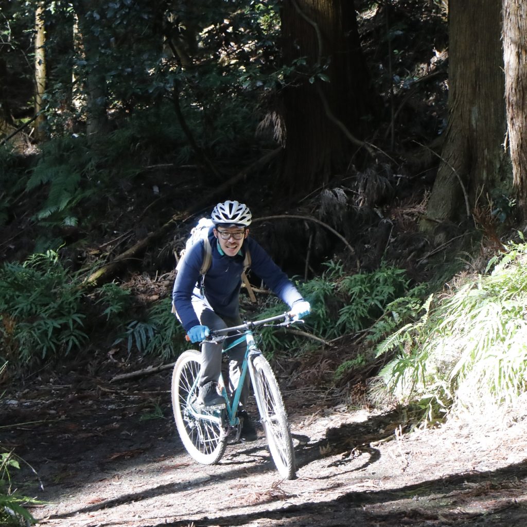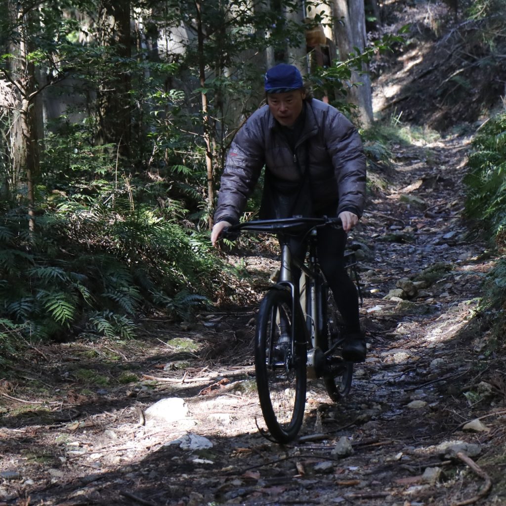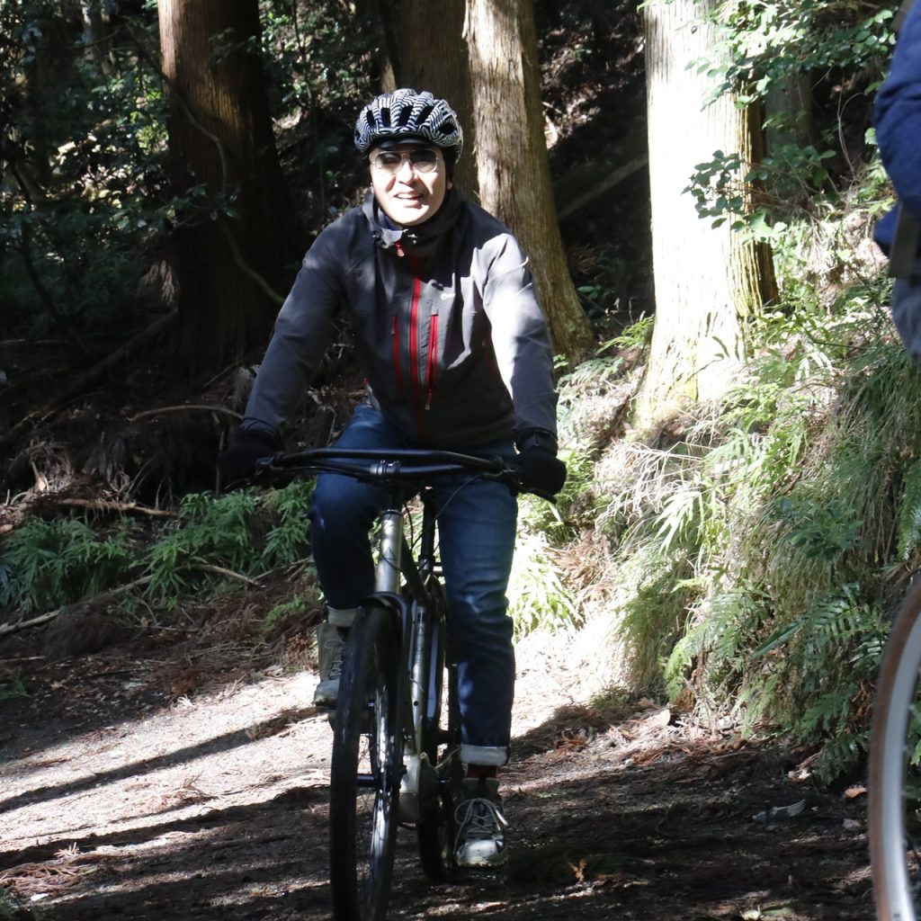 みんながヒイヒイ言って坂をおぼっている中、ひとり涼しい笑顔のスタッフ梶山氏。