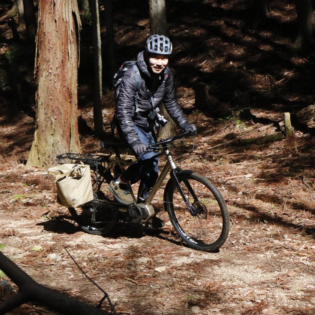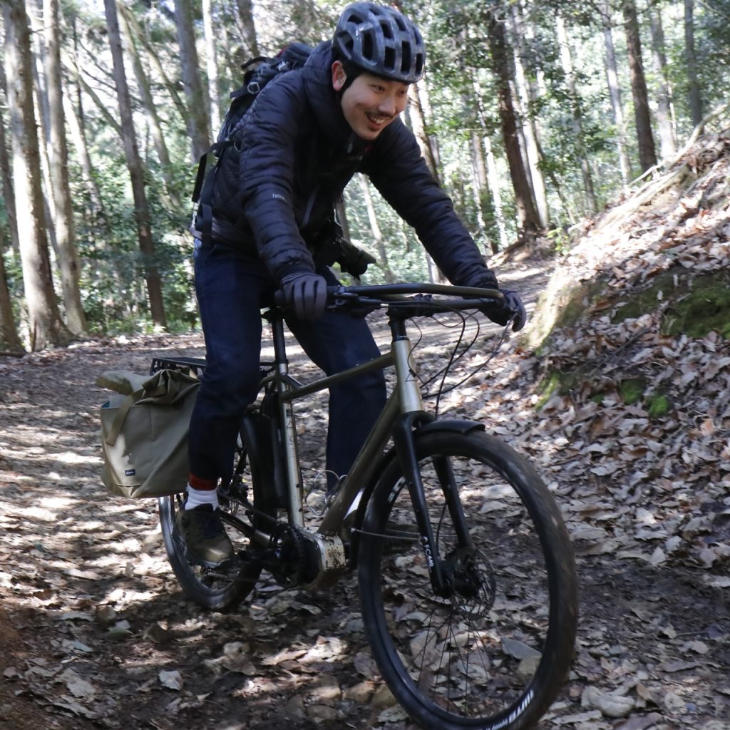 それもそのはず、彼の駆るのはFUJI FARPOINT。メーカーさんから試乗車をお借りしているEグラベルバイク!