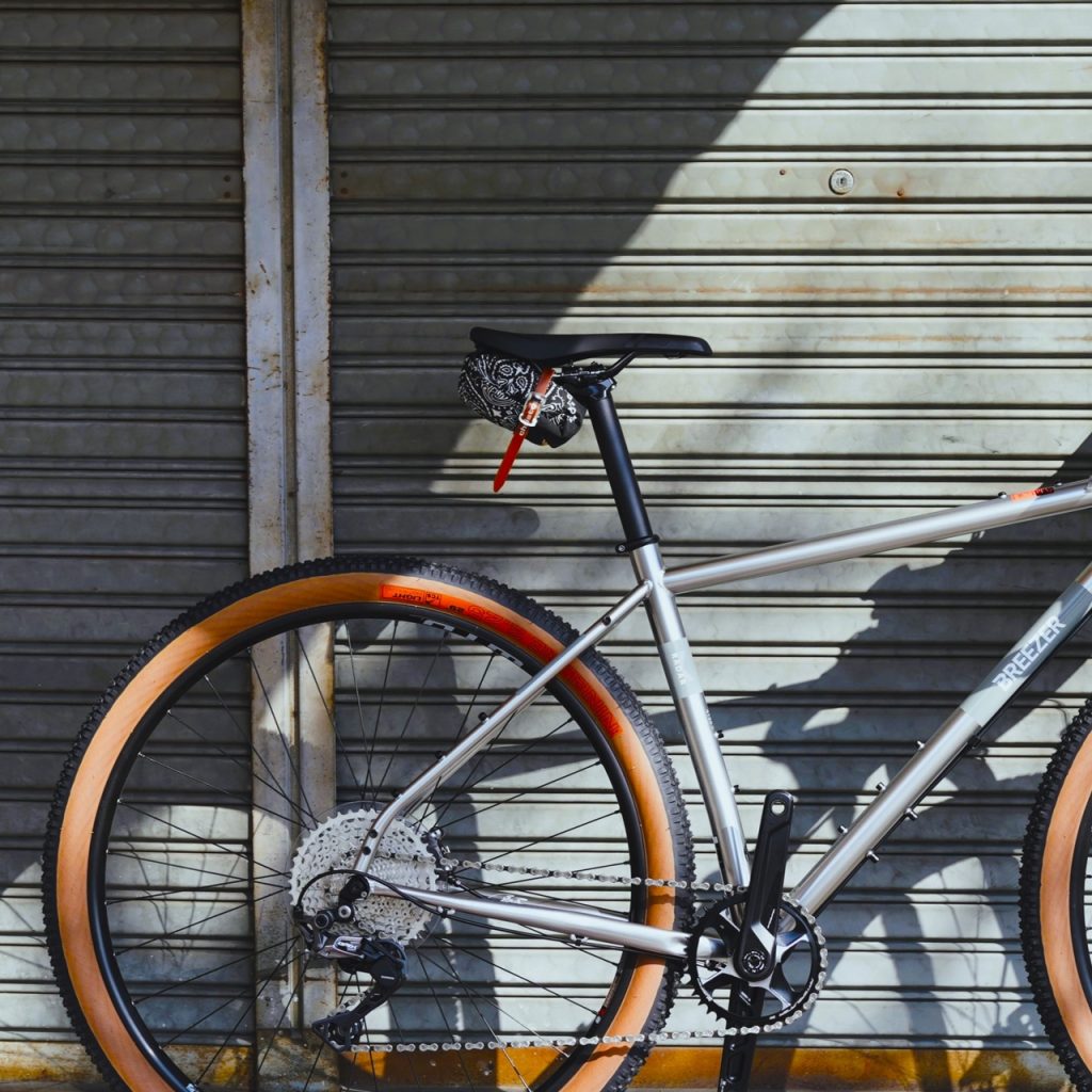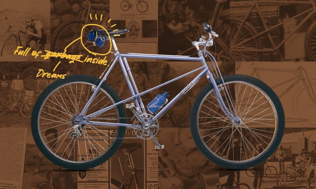 マウンテンバイク黎明期、サドルバッグ代わりにバンダナでチューブや工具を巻いてストラップで括り付けていたスタイル。