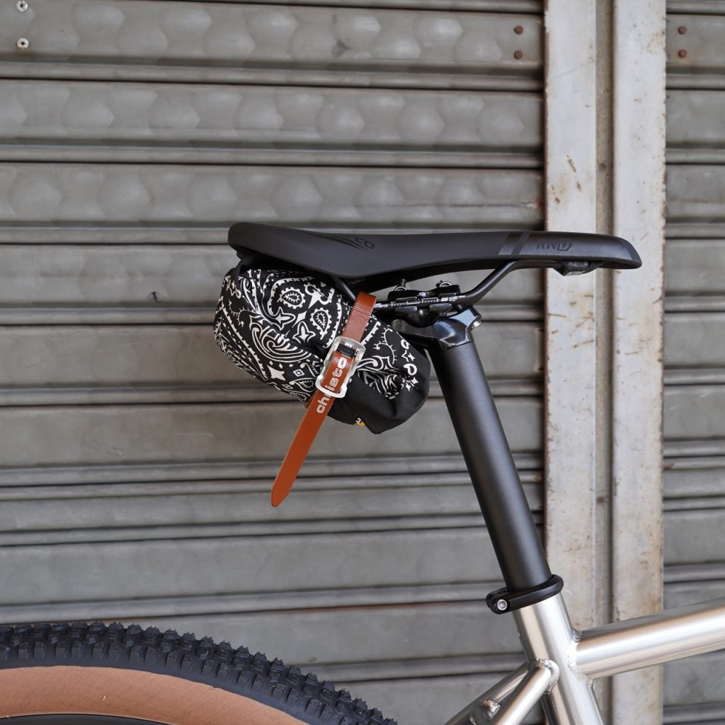 チューブや携帯工具などライドの必携品をクルっと包んでトゥーストラップでサドルの後ろに括り付けるだけ。