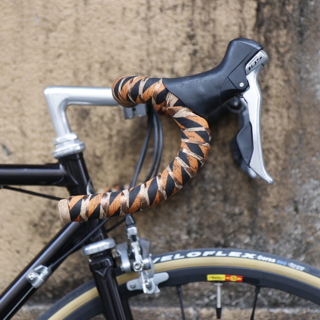 パナソニックホームページのサンプル画像では、ハンドルにクラシカルなフォルムのNEAT MOD 185が採用されておりますが、STIレバーの取付が低い位置になる為、前傾姿勢がキツクなりがち⇒今回は同社M106NASを採用。ハンドルクランプ位置とほぼ同じ高さにレバー位置がきますのでステムを低く設定でき、車体全体のフォルムも◎◎◎。バーテープは有機的なコルク素材をベースに個性的なルックスのBTP製をチョイス。