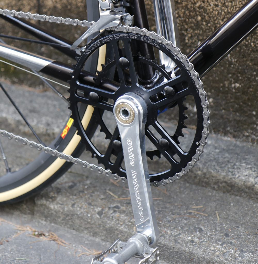 コックピット&コンポーネントのシルバーにあわせ、またクランクはやっぱりボルトオンタイプがカッコイイ!よねって事で、アルミ削り出しの美しいUSAブランドWHITE INDUSTRIES製をチョイス。エキストラクターの真鍮も良いアクセントに。