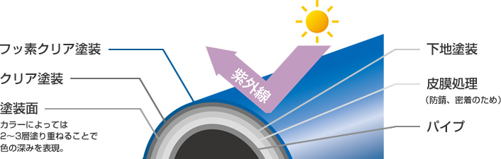 最終表面に時間の経過や日射・雨風に耐候するフッ素クリアを塗装し、長期にわたり美しさを保ち、丈夫なフレーム塗装を実現します。