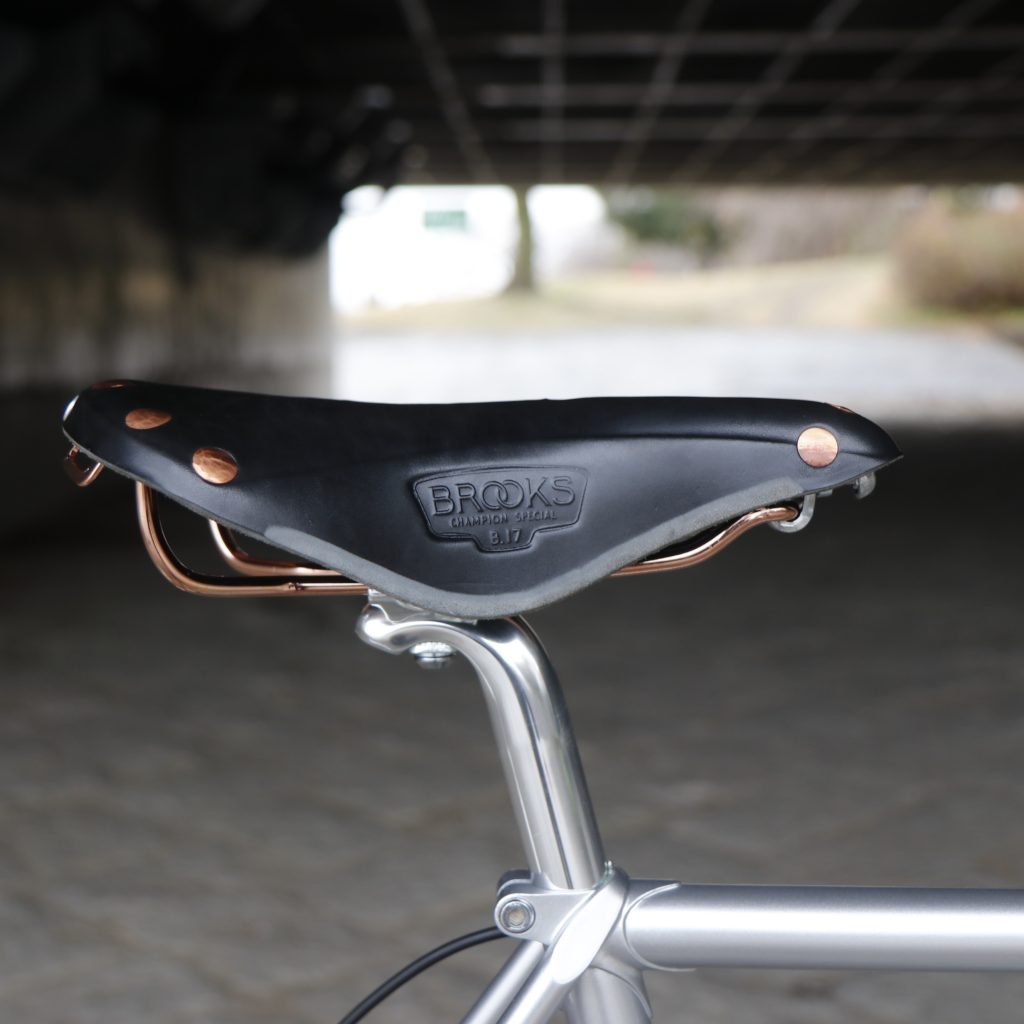 英国ブランドBROOKS社のB17 SPECIALサドル。SPECIALは、熟練の職人が一つ一つ手作業で打ち込む大きな銅鋲とレールに施された美しい銅メッキが特徴的 & 今回の完成車のカラーアクセントにも◎◎。