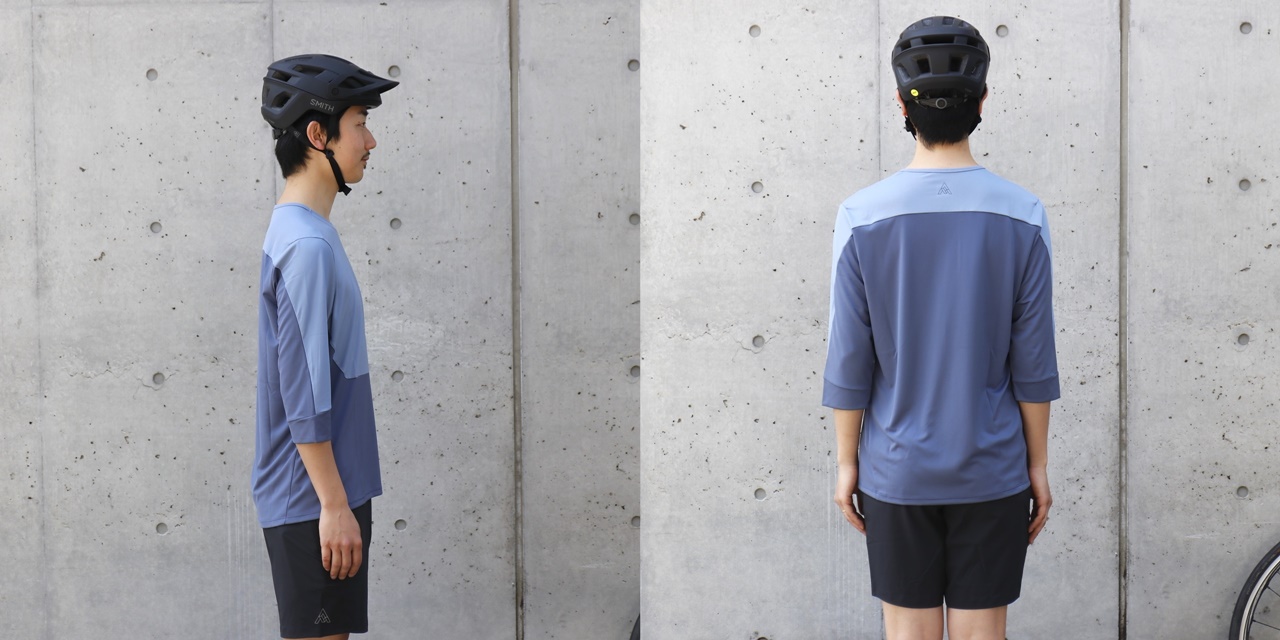 十分に伸縮性のある素材に加え、7meshらしい立体縫製は特に肩回りの突っ張りが感が無く快適至極。