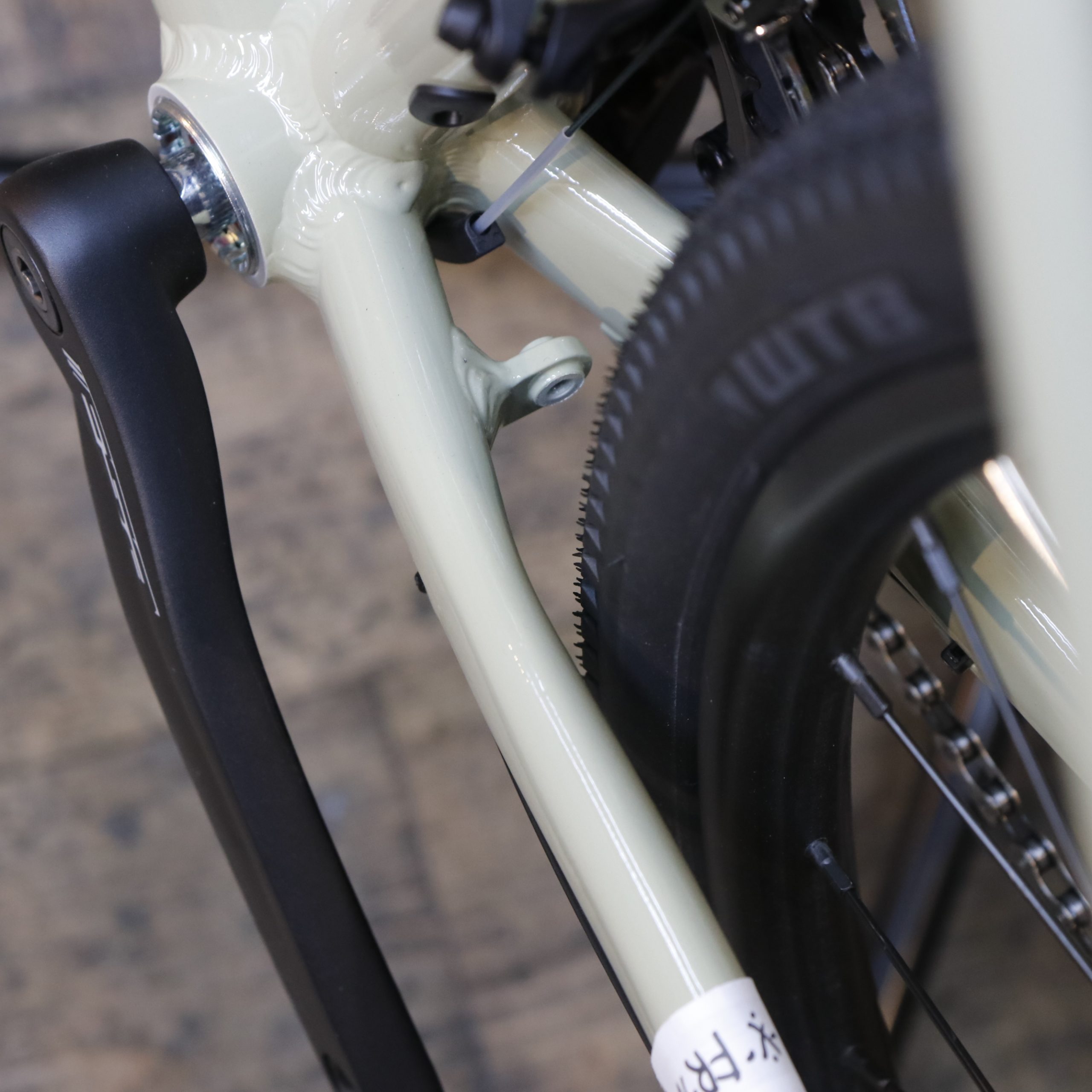 最大タイヤクリアランスの公表値はありませんが、純正タイヤ700x37Cの状態で左右ともに10mm近く隙間がありますので、45C~50Cあたりまで装着可能でしょう。
