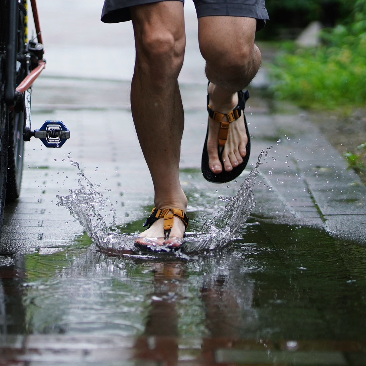素足を解放して風を感じながらペダルを回すのはとっても気持ちがいいし、雨の日はシューズや靴下の濡れを気にしなくていいし。
