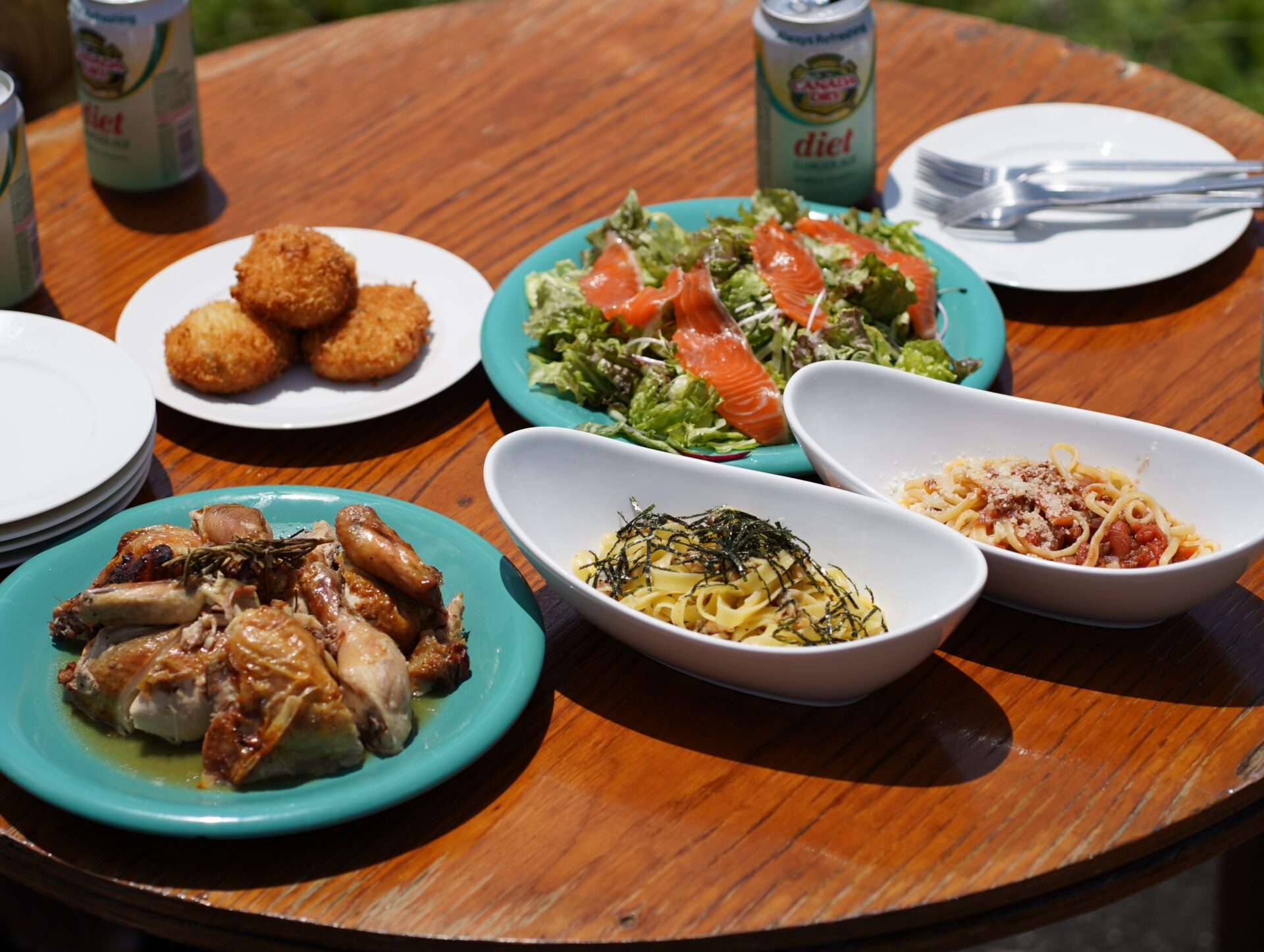にてとっても美味しい料理(名物ローストチキン、自家製生パスタ、サラダ、クリームコロッケ)がふるまわれます!