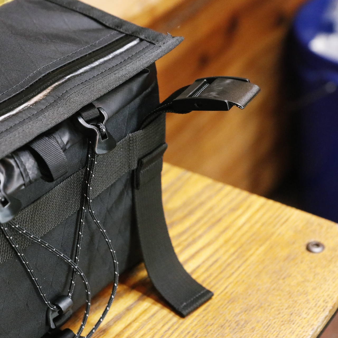 ステムを支点に、フラップに用意されたAtwood社製のタクティカルコードでテンションをかけ、バッグがコクピット内でビシっと美しく水平を保ちます。