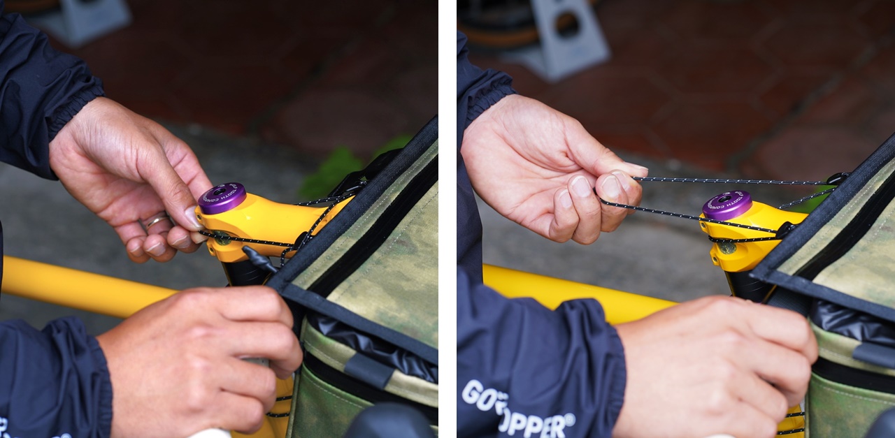 ハンドルバーとの固定用ストラップ×2、ヘッドチューブへの固定用コード×1に加え、メインフラップの開閉を行うコードをステムに引っ掛けてギュッと絞れば、バッグがお辞儀しないようにテンションがかかる構造。