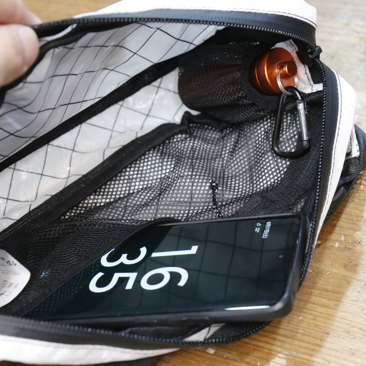 外側にファスナー付きポケット、内部はファスナー付きメッシュポケットと両サイドに小さなストレッチメッシュポケット。