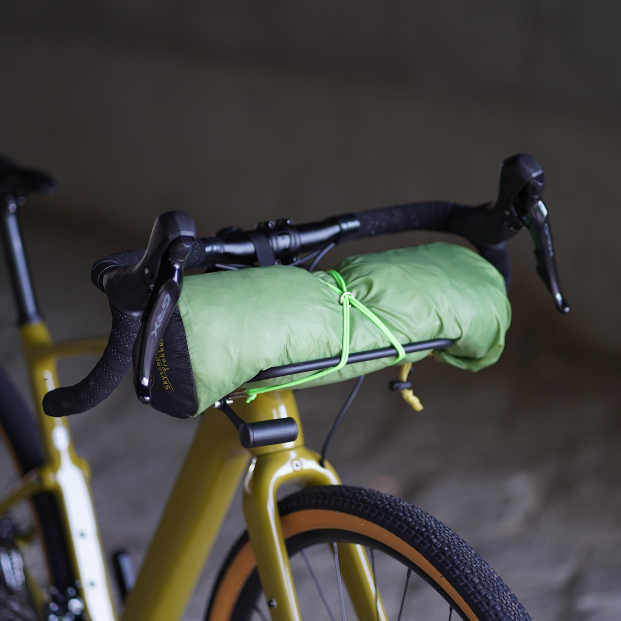 ツーリングの際に使用する大き目のハンドルバーバッグのサポーターとして、またラックとしてテントやシュラフのような荷物を積載するのに役立ちます。