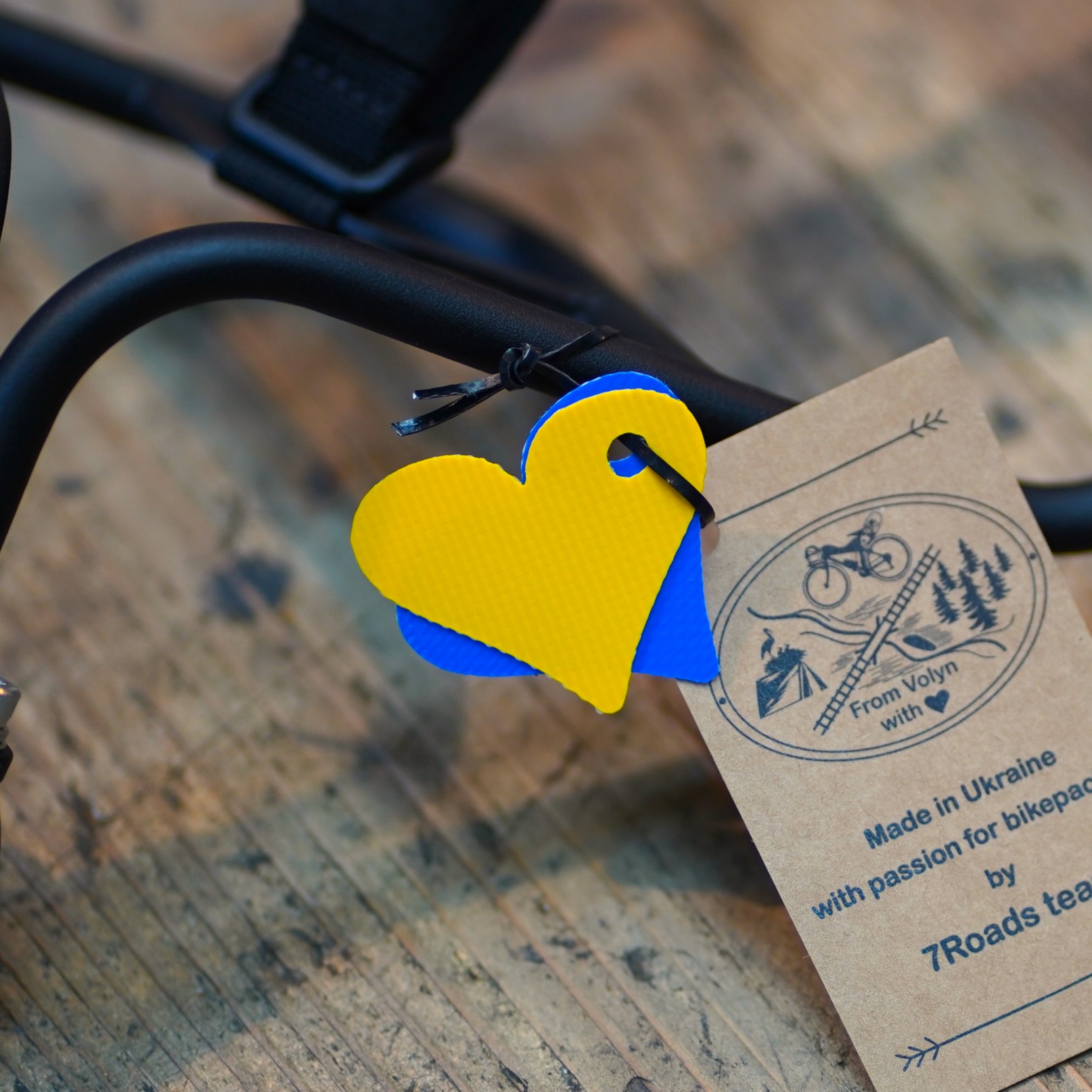 何か製品の廃材で作られたのでしょうか?ウクライナ国旗カラーのハート型チャームがタグに添えられております!