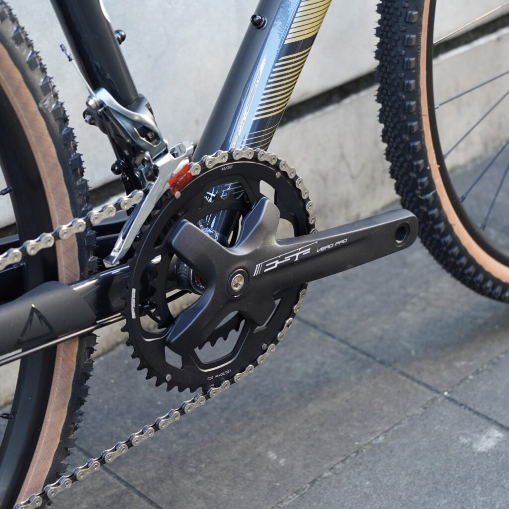 クランクセットはFSA製、46/30Tのグラベルギア比。変速精度やスクエアテーパーゆえの剛性感を気にするならシマノ製ホローテッククランクに交換するのもアリ。