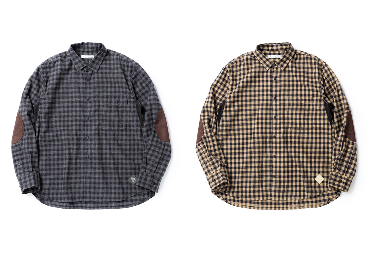 保温を目的とした厚手のネルシャツではなく、運動量の多いシチュエーションに照準を合わせた薄手のコットンネル生地を採用。エルボーパッチデザインや、製品洗いを加える事でビンテージ調のネルシャツに仕上げています。 通常より細い糸で織り上げたコットンネルは、軽量で適度な通気性があり、脇下のベンチレーションと相まって半袖シャツのような軽い着心地を実現しています。 アウトドアフィールドにおいては長袖である必要性が高い事から、袖まくりをしやすい袖口構造を採用し、フレキシブルな対応を可能としています。 ボタンは全てスナップボタン仕様として脱ぎ着がしやすく、朝晩の羽織りから寒い時のプラスワンレイヤーとして重宝します。 後身頃に横方向への自由度を大きく取れるインパーテッドプリーツを採用する事で、動き易さとすっきりとしたシルエットを両立しています。