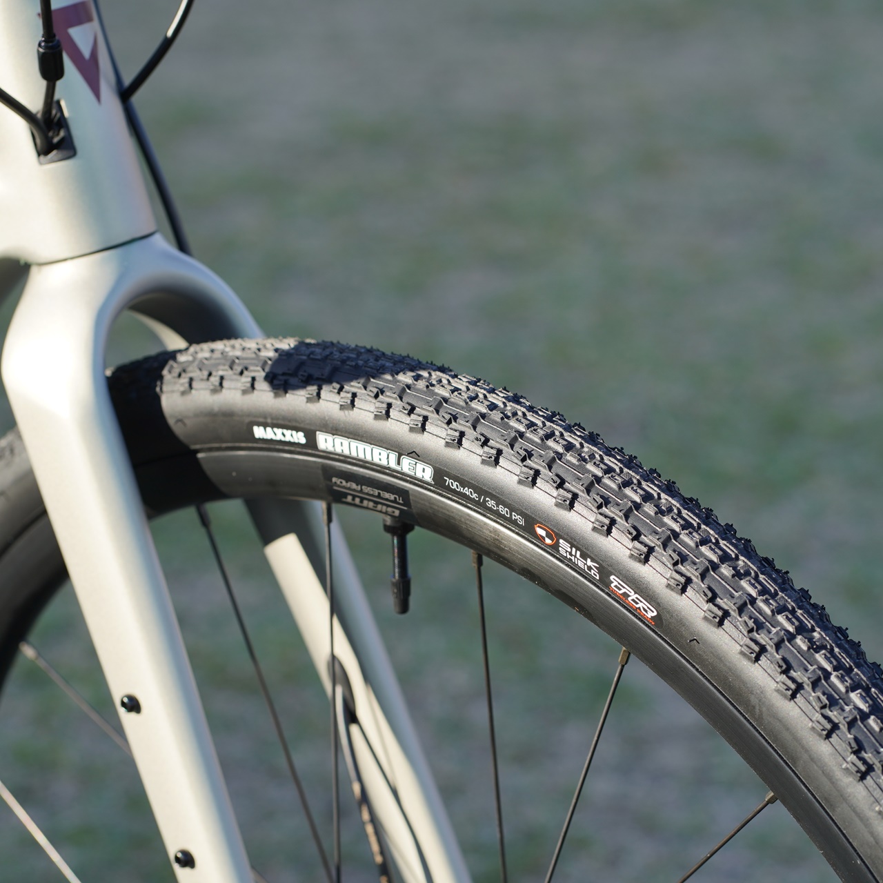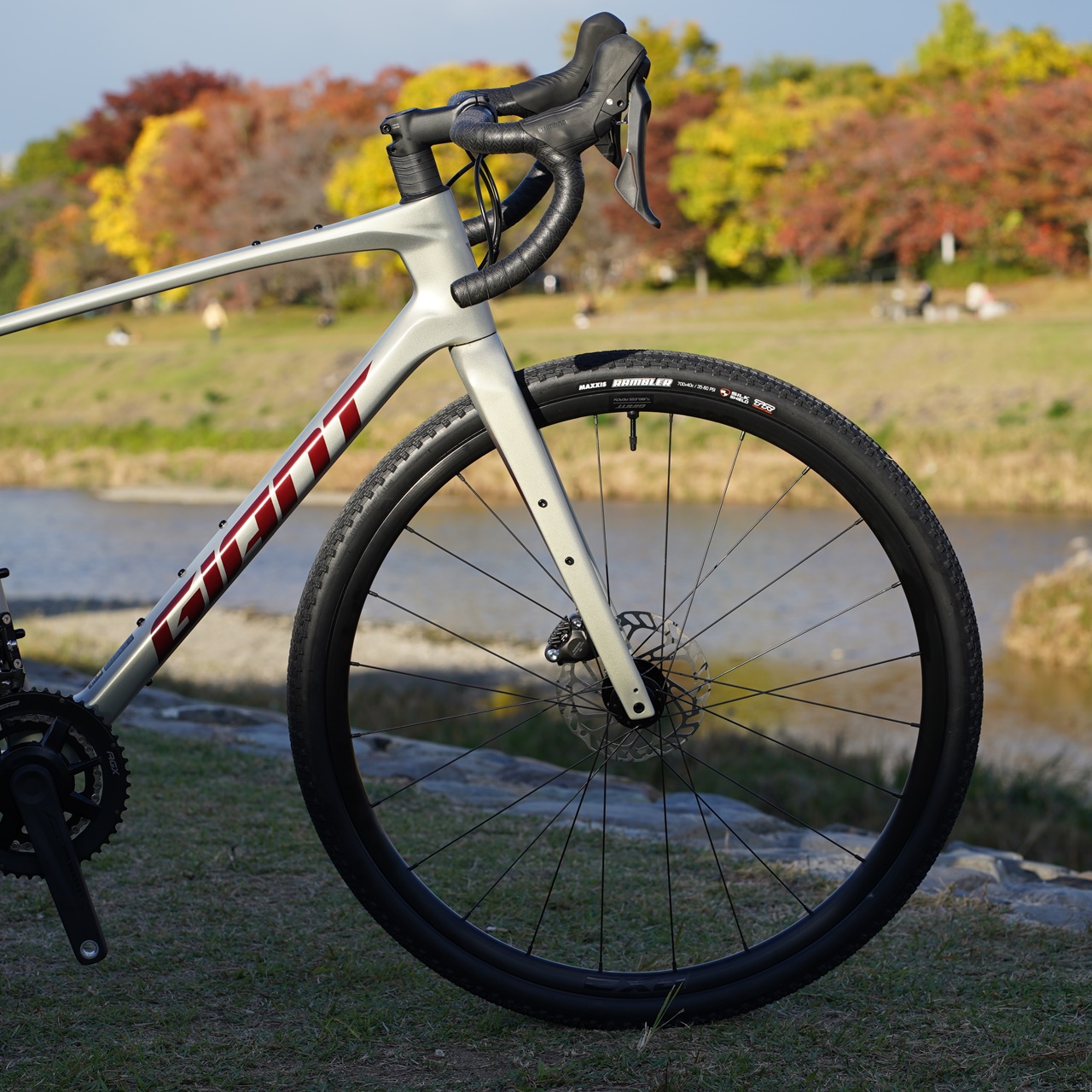 タイヤチョイスはグラベルタイヤとしてはド定番の40cサイズ。MAXXIS RAMBLER、転がりもグリップもよく我々スタッフの間でも評価の高い名作です。GIANTは最初っからチューブレスでのセットアップになっていることもポイント!