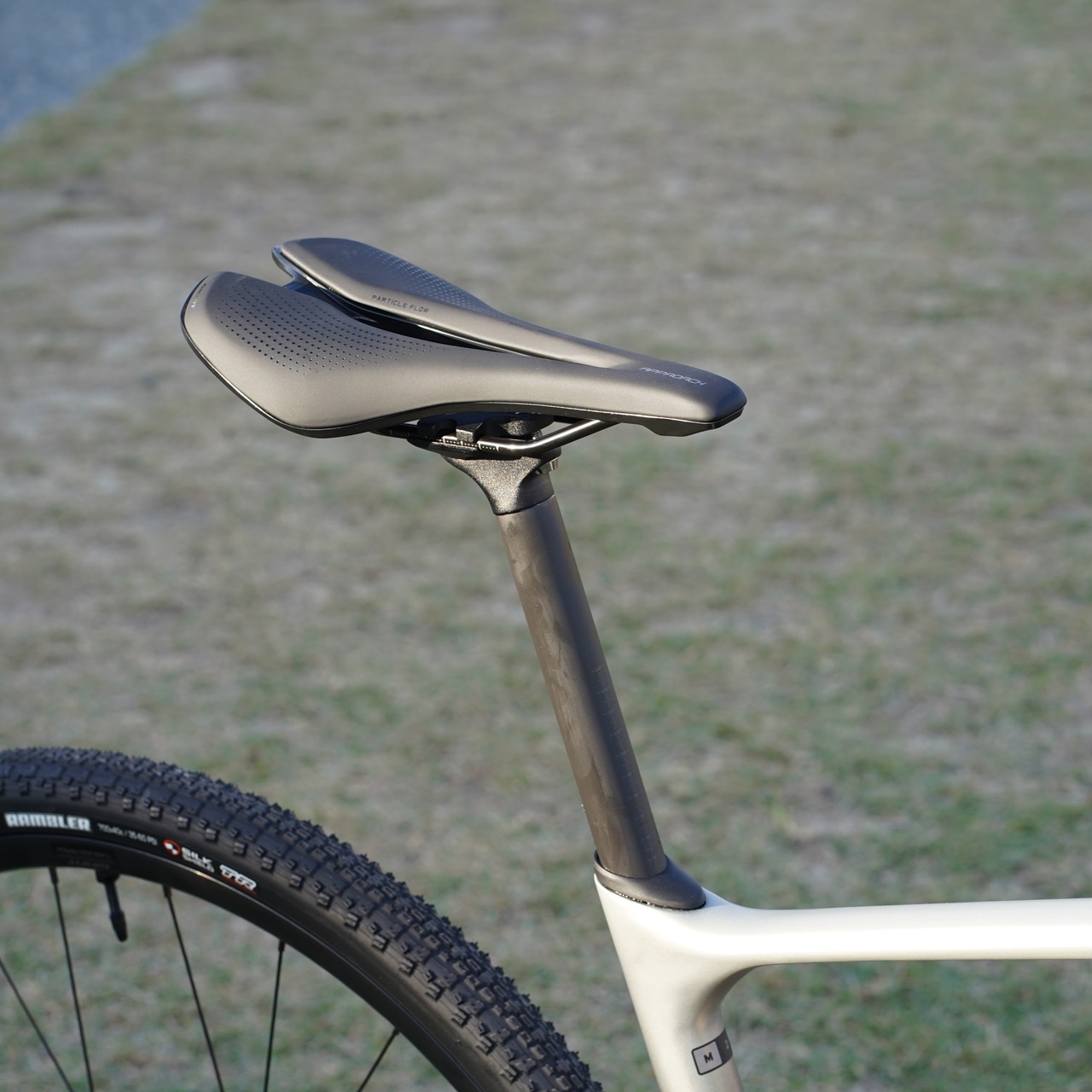 フレーム設計と合わせて快適性を演出するD型断面のシートポスト。φ30.9の丸断面ポストも使用可能なのでドロッパーへの換装もOK。
