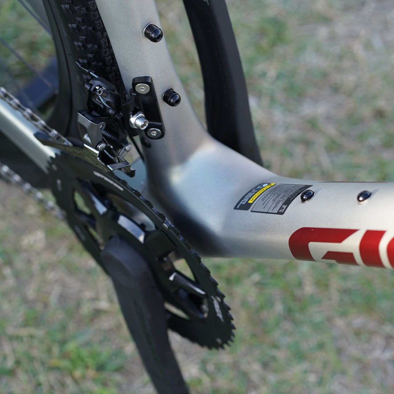 キャリアダボこそオミットされているものの、モダングラベルバイクのスタンダードセット(トップチューブ上面、フォークサイド、ダウンチューブ下面)を完備
