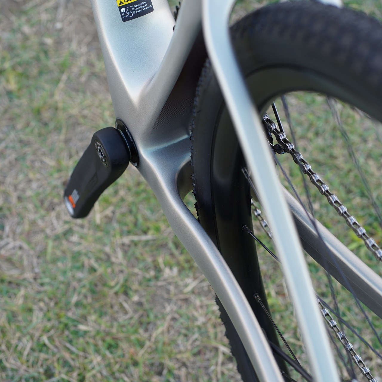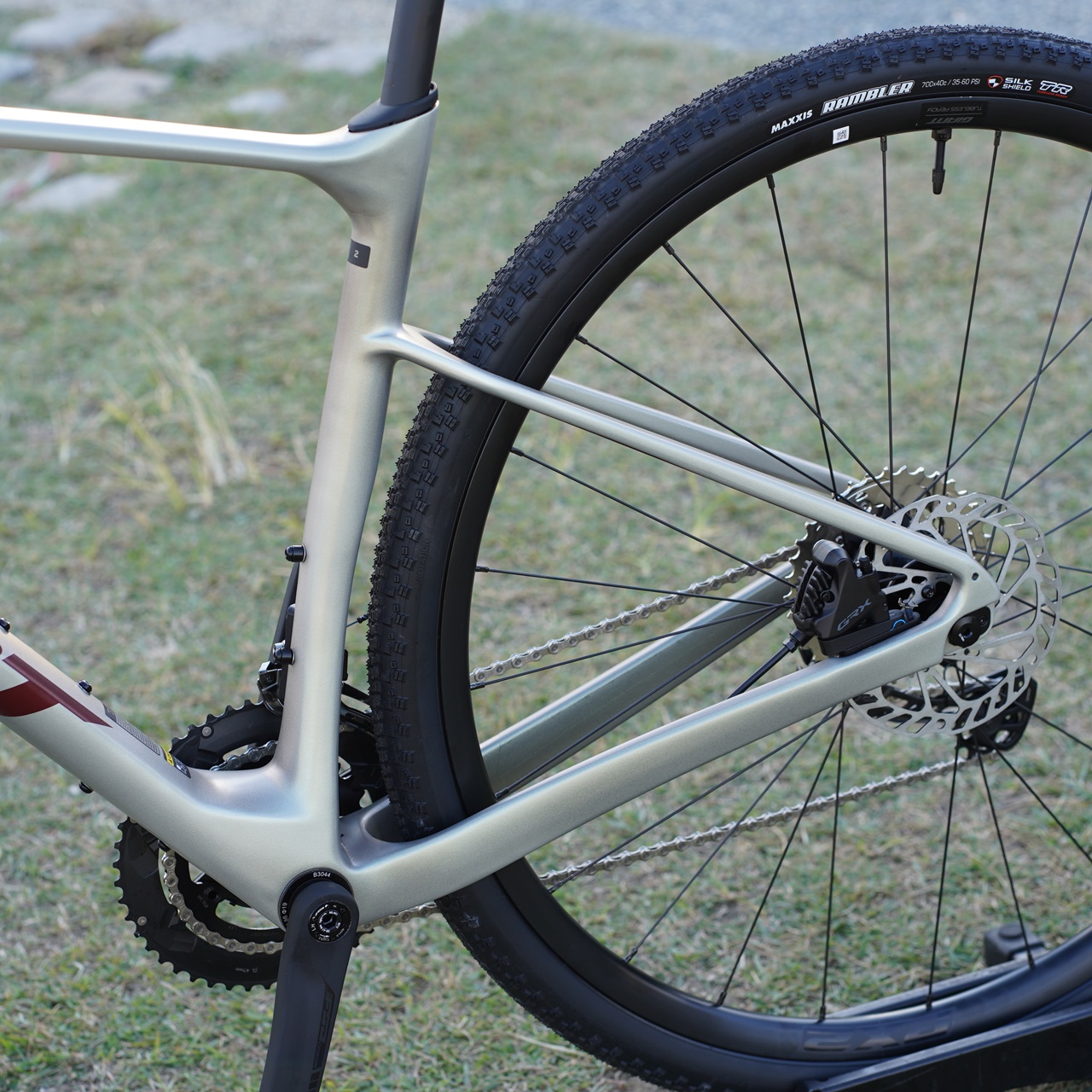 そんじょそこらのグラベルバイクをはるかに凌ぐMTB並みの超ワイドクリアランスを備え、砂利道はおろかちょっとしたトレイルまで攻められそうなアドベンチャーっぷり。