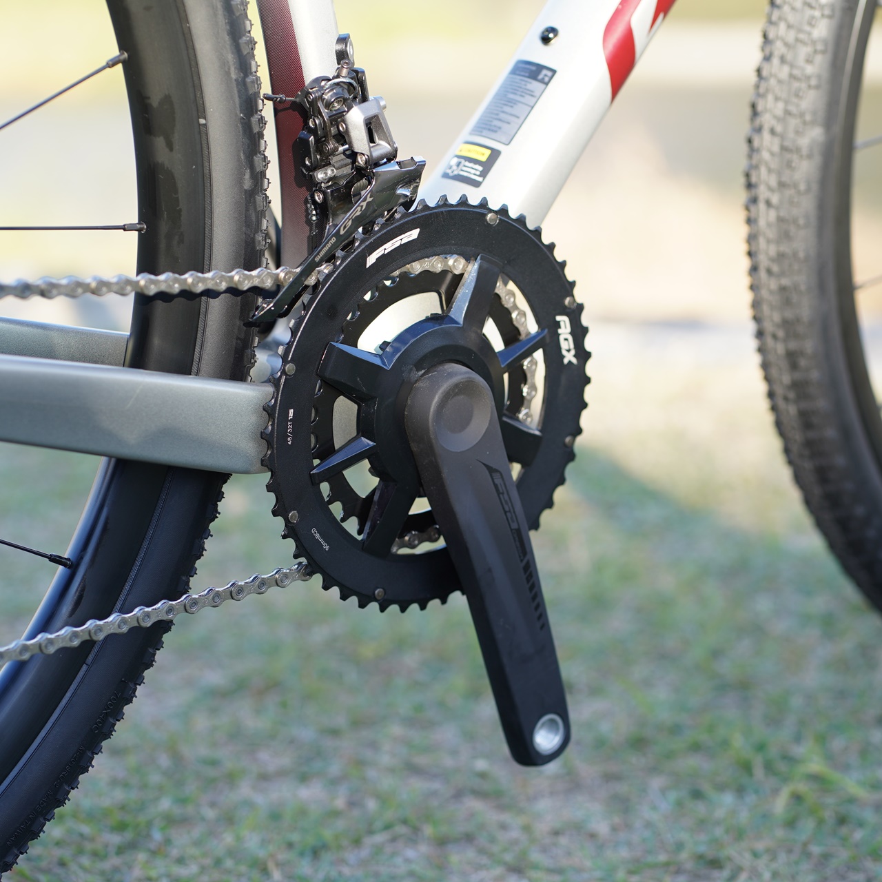 クランクセットはFSA Omega Modular AGX+。48/32Tというグラベルバイクとしては高速よりのギアレシオ。もちろんロー側も余裕で1以下の低ギア比を実現していますし、高速巡行から厳しいダートの上りまで対応するスピード域の広さがなんともREVOLTらしいところ。