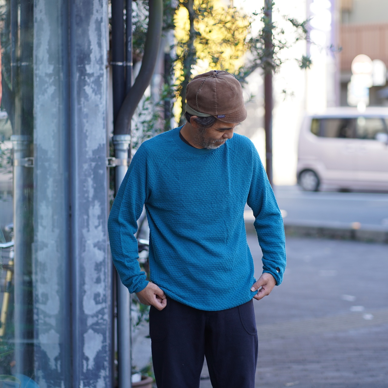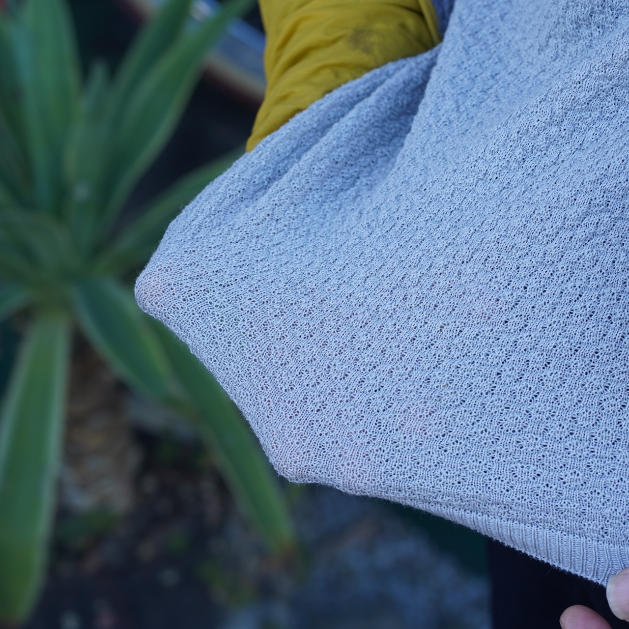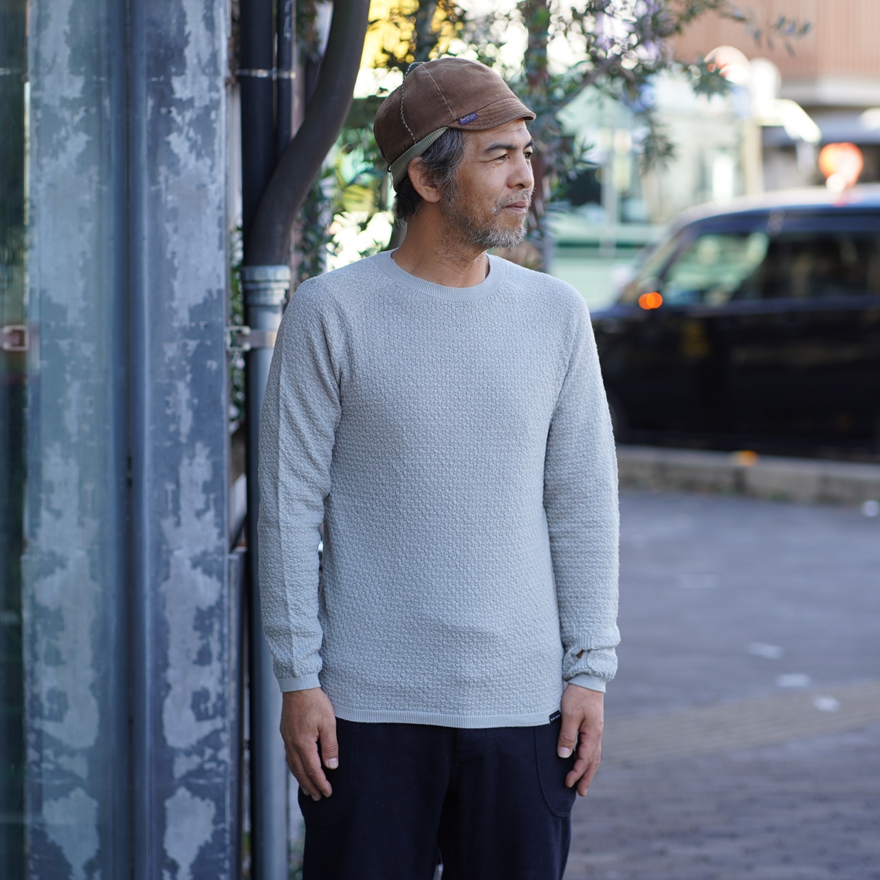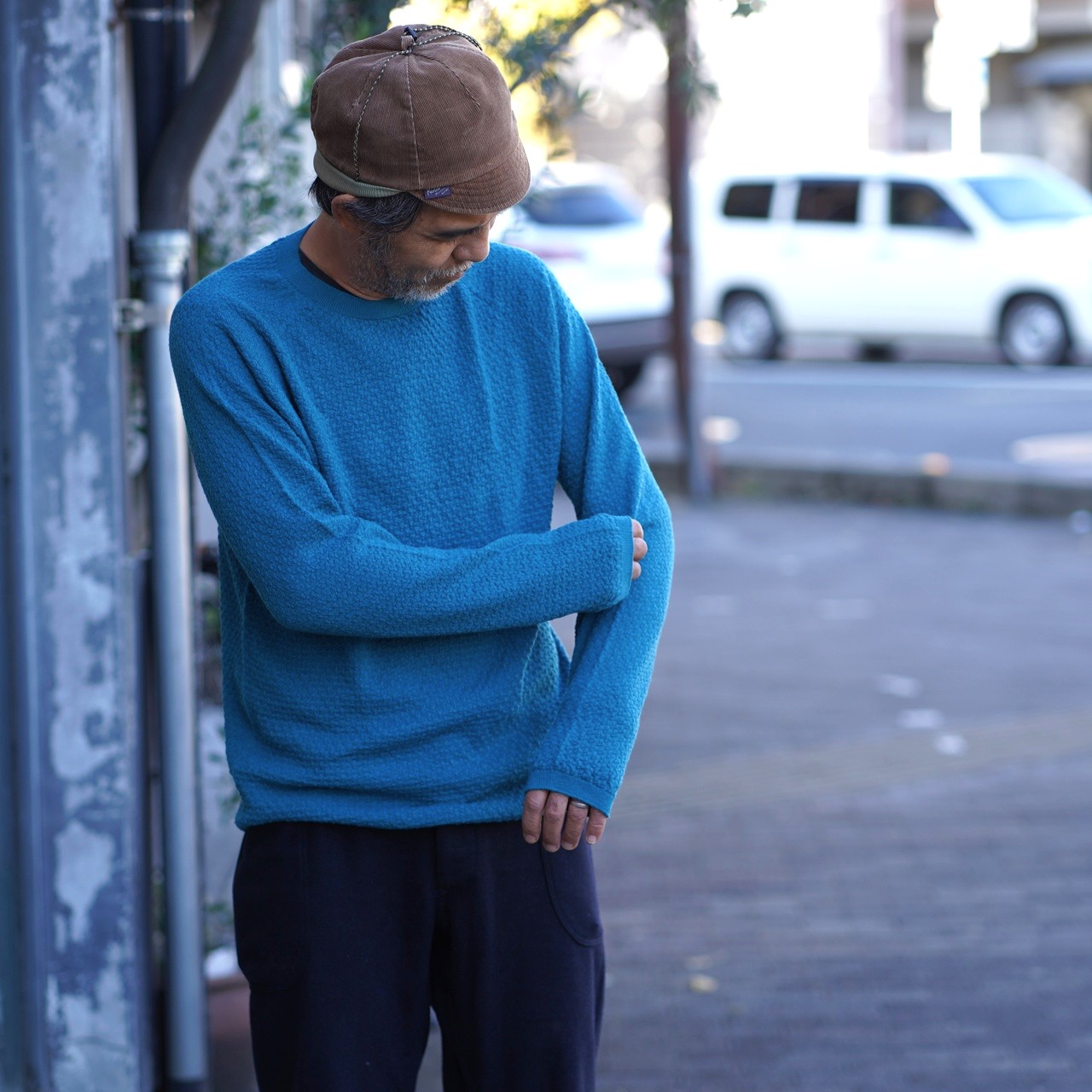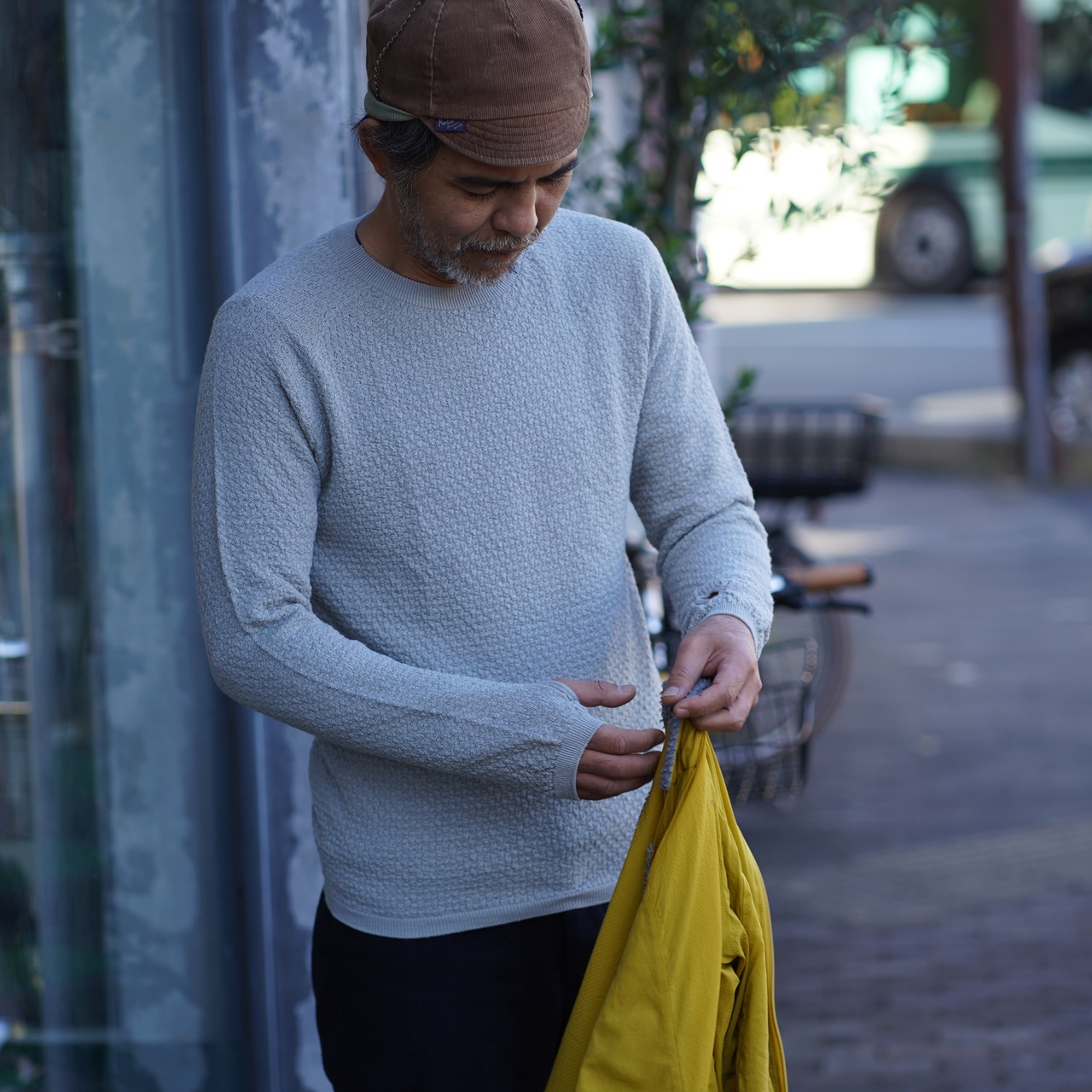 単体で着れば網目の隙間から程よく風が通るので蒸れ知らず、一枚上に羽織ればニット地の凹凸が空気を保持し暖かいニット感覚。
