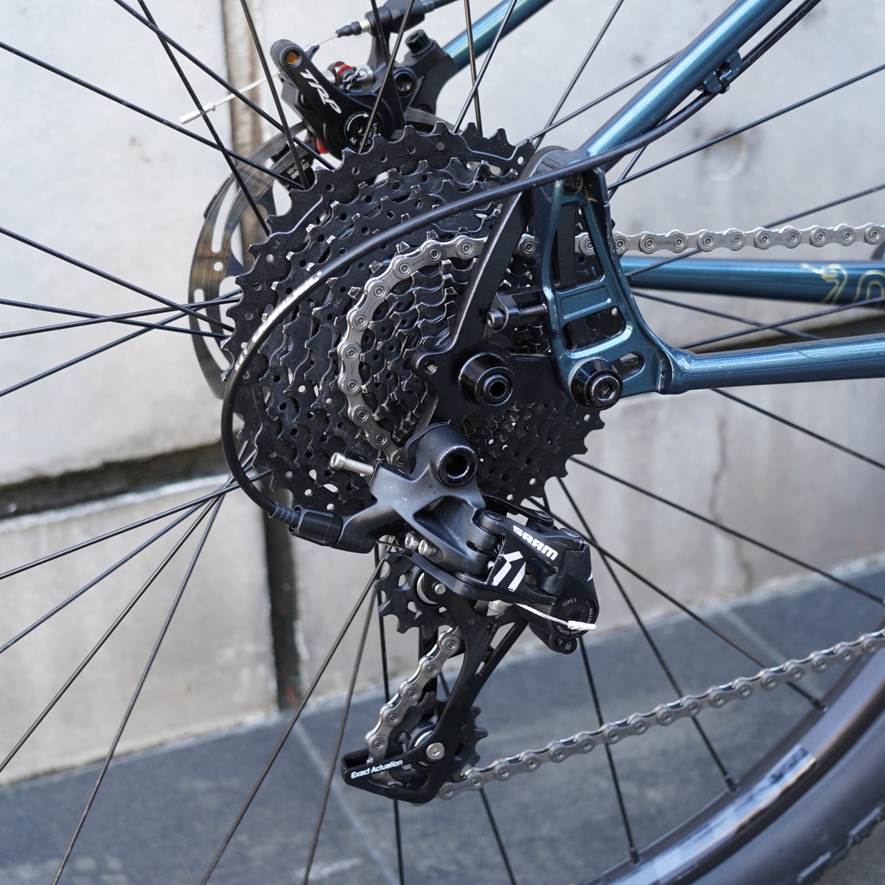 メインコンポはSRAM APEX 1、1x11speed。クラッチ付でトラブルが少なく、信頼性の高いコンポーネント。最小ギア比は0.76とトレイルでも重積載でもしっかり対応できる設定。