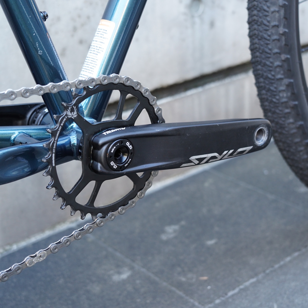 TRUVATIVのクランクセット。DUB規格の大口径スピンドルを採用し高剛性が期待できます。歯数は32T、舗装路の下りでスピードを出そうと思えばちょっと回しきっちゃうかも。