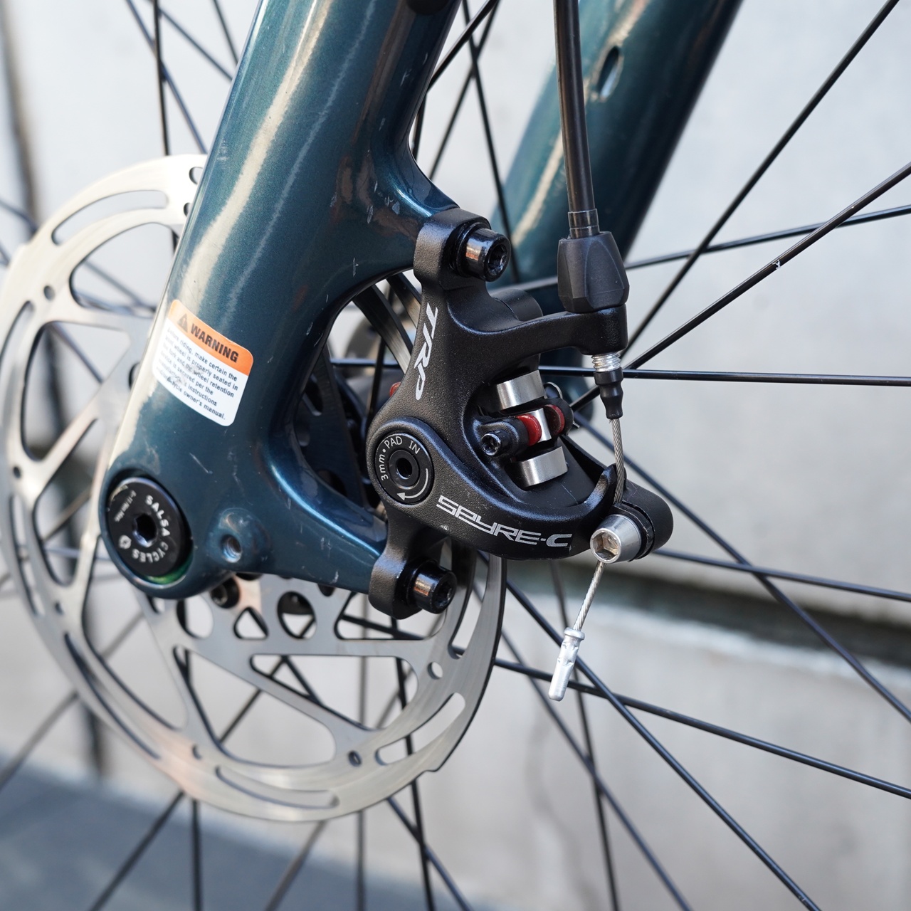 TRP SPYRE-C、両押ピストン採用の機械式ディスクブレーキを採用。悪くないパーツチョイスですが、さらなる制動力を求めるならEQUALなどへのカスタムもおすすめ。