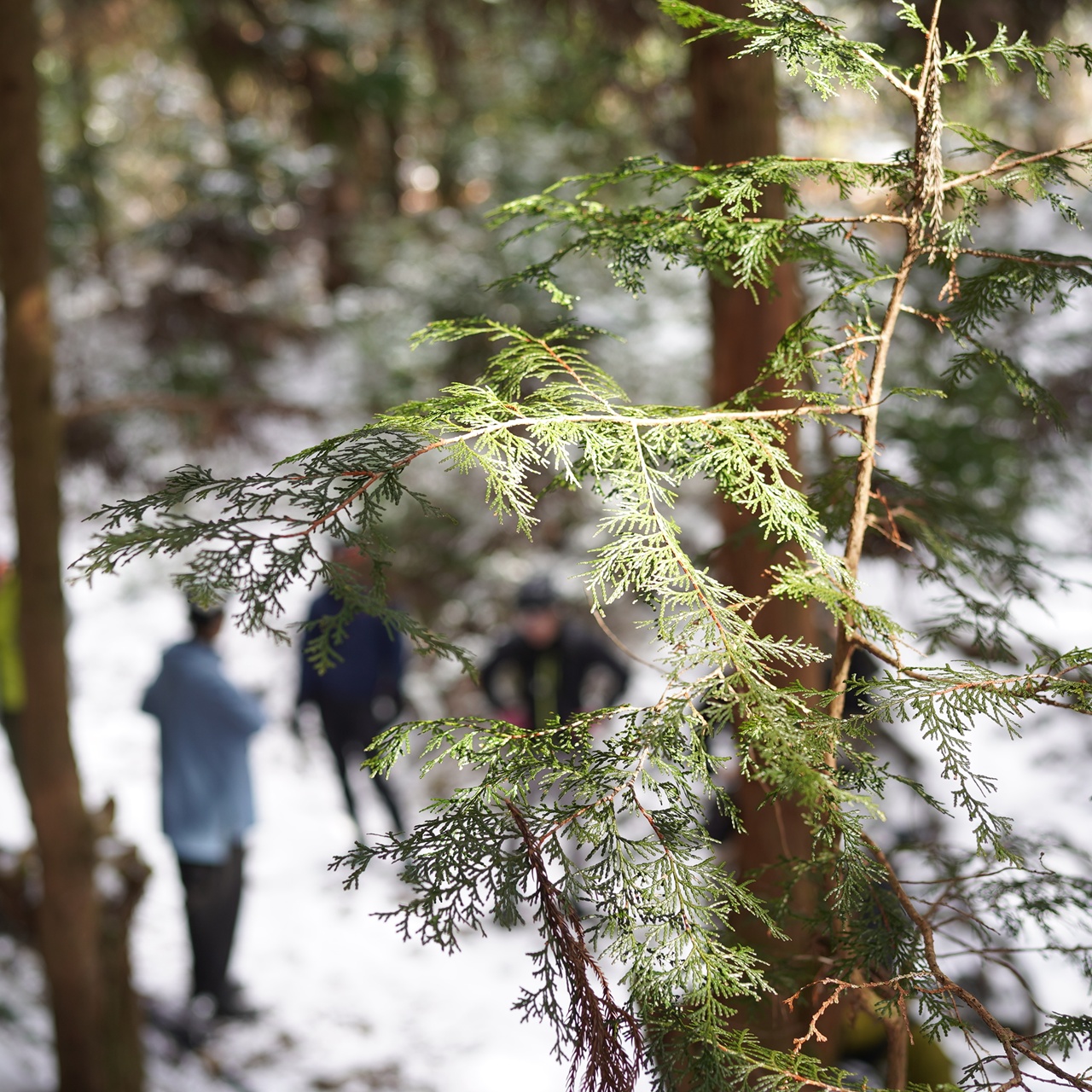 木漏れ日と雪のコントラストが美しい場所でしばし休憩。