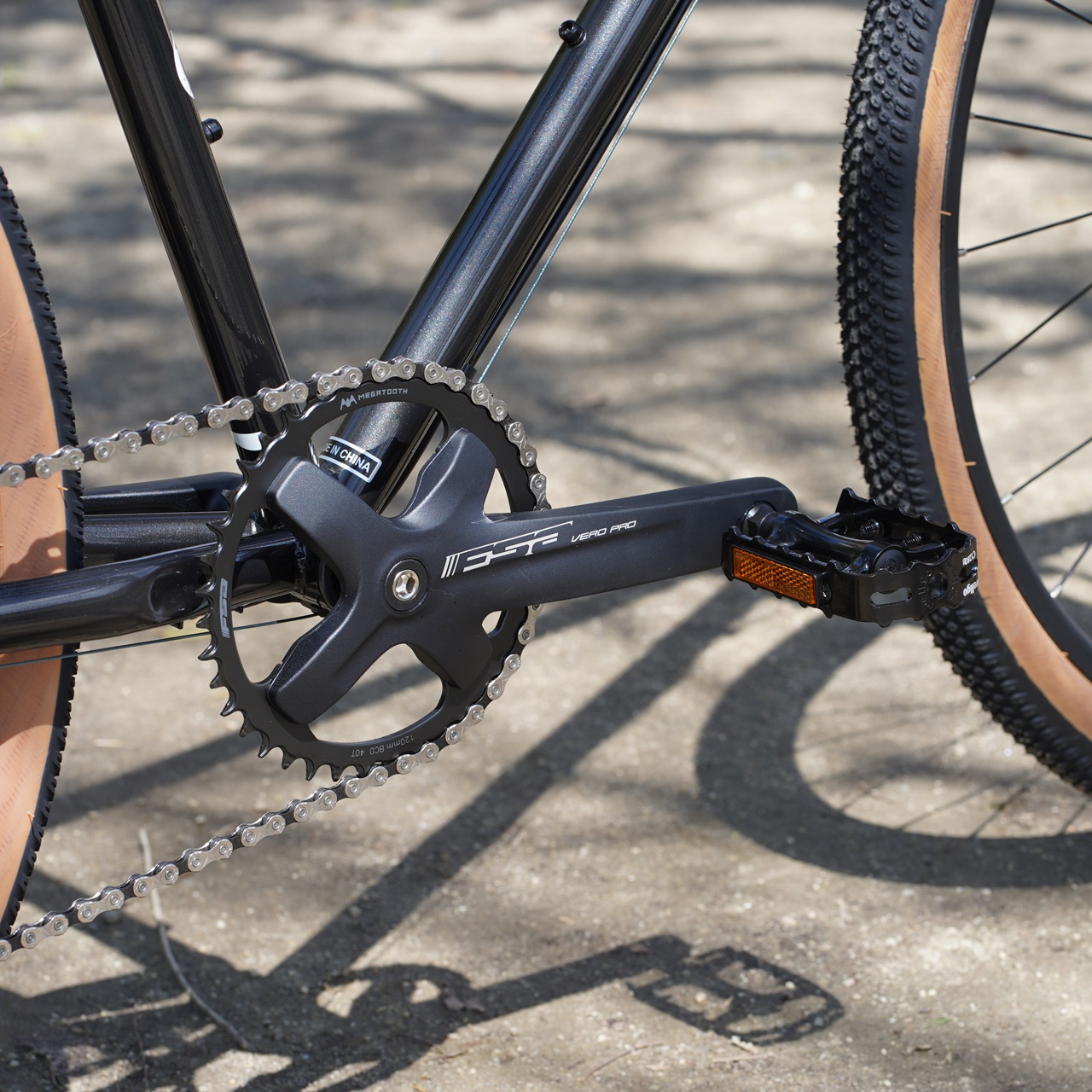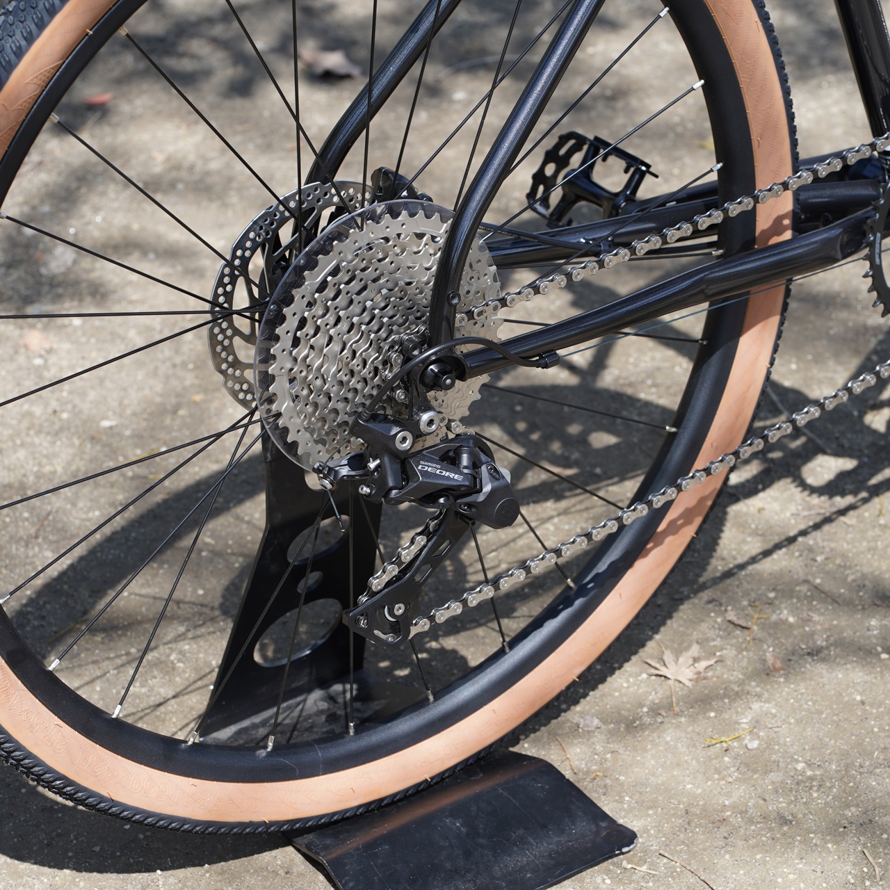フロントシングルでスタビライザー付きRD、ワイドなリアスプロケットもしっかりグラベルバイクスペック。