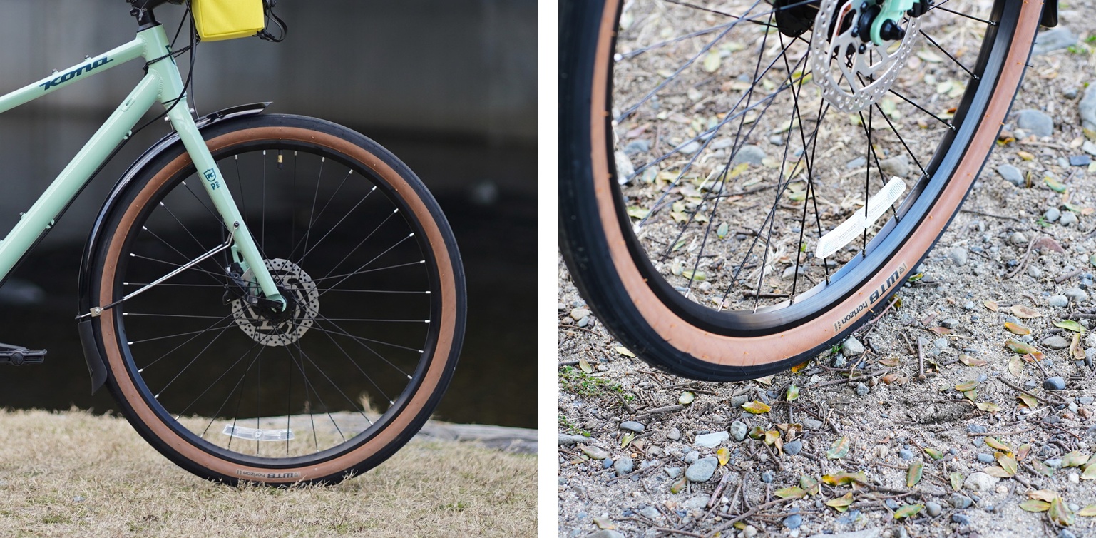 タイヤにはオンロードの軽やかさと、荷物を積んだ長距離旅やグラベルライドなんかにも適応する、650×47タイヤを採用。