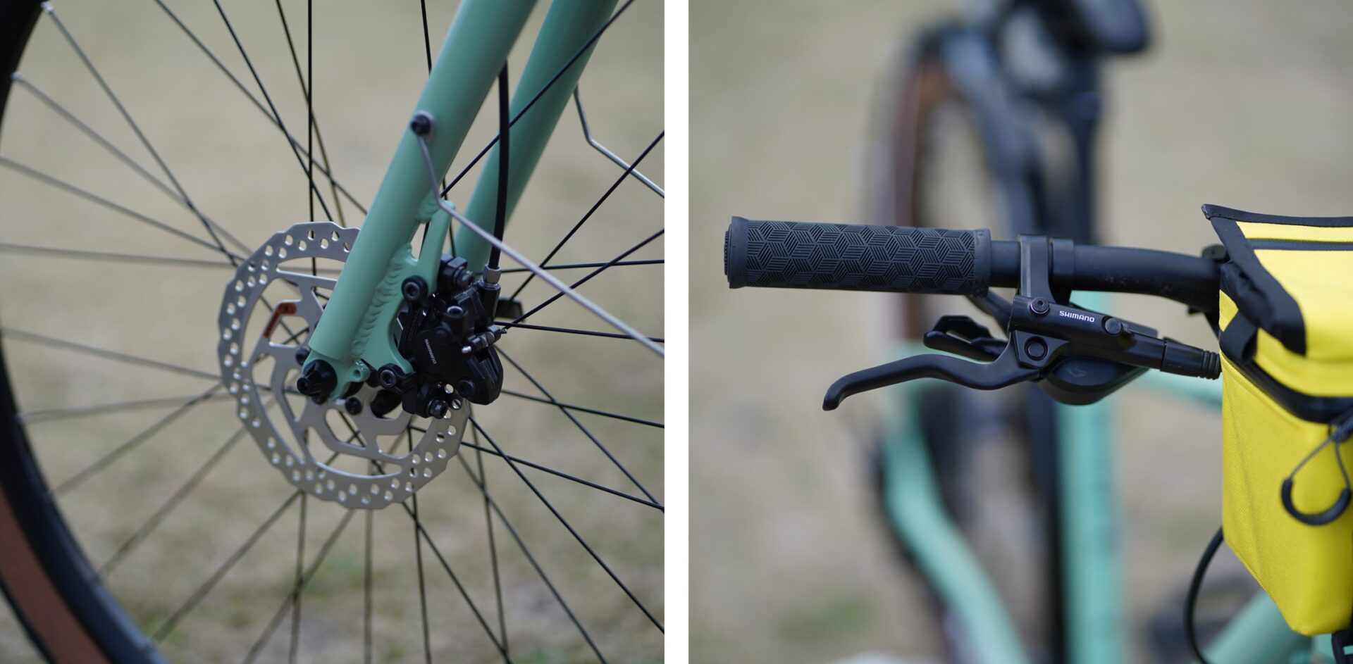 小さな力で確実に止まるSHIMANO製「油圧ディスクブレーキ」が採用。