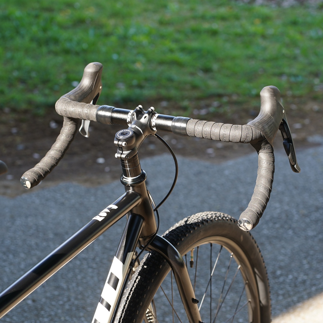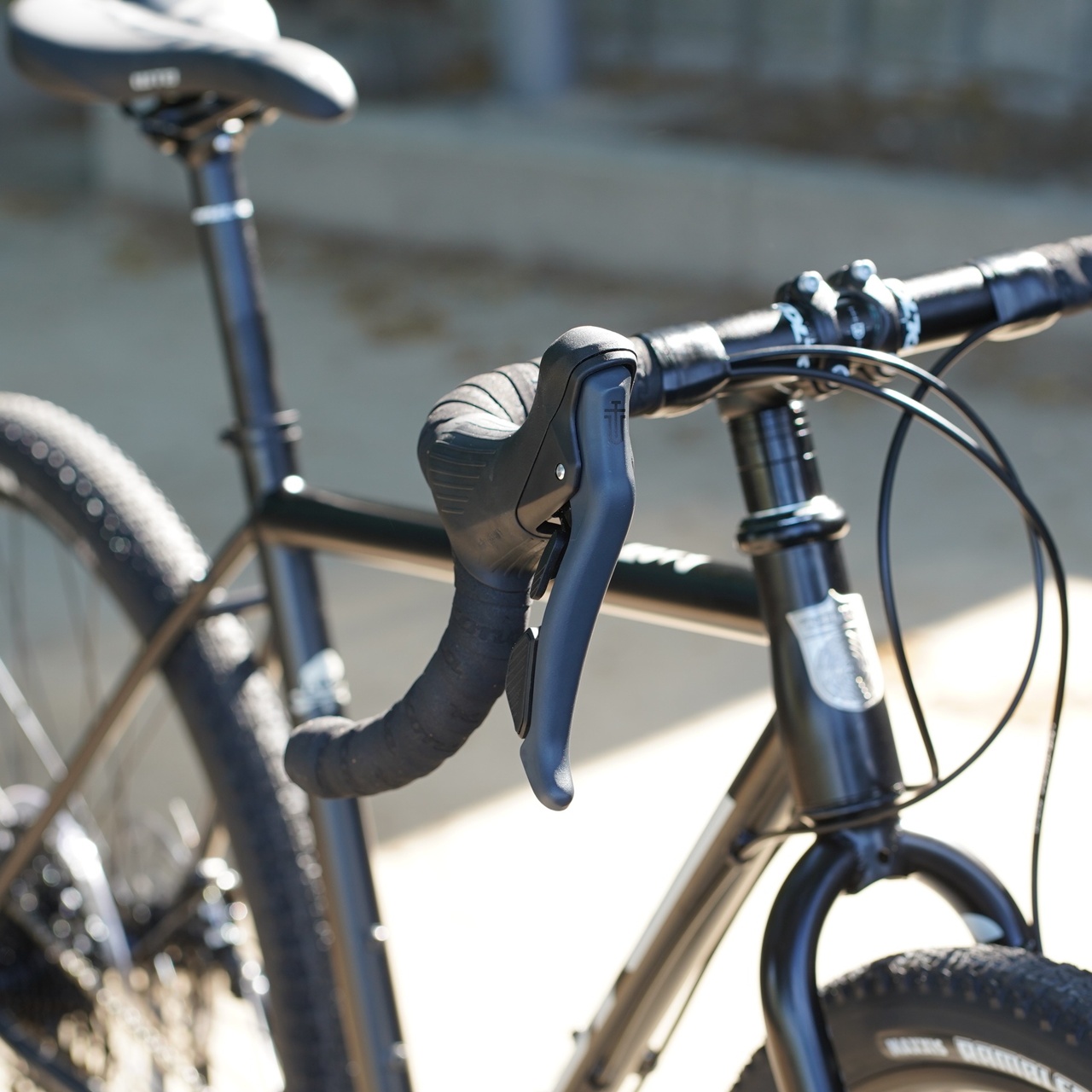 ややフレアしたドロップハンドルはオンロードもオフロードも走りやすいバランス重視。