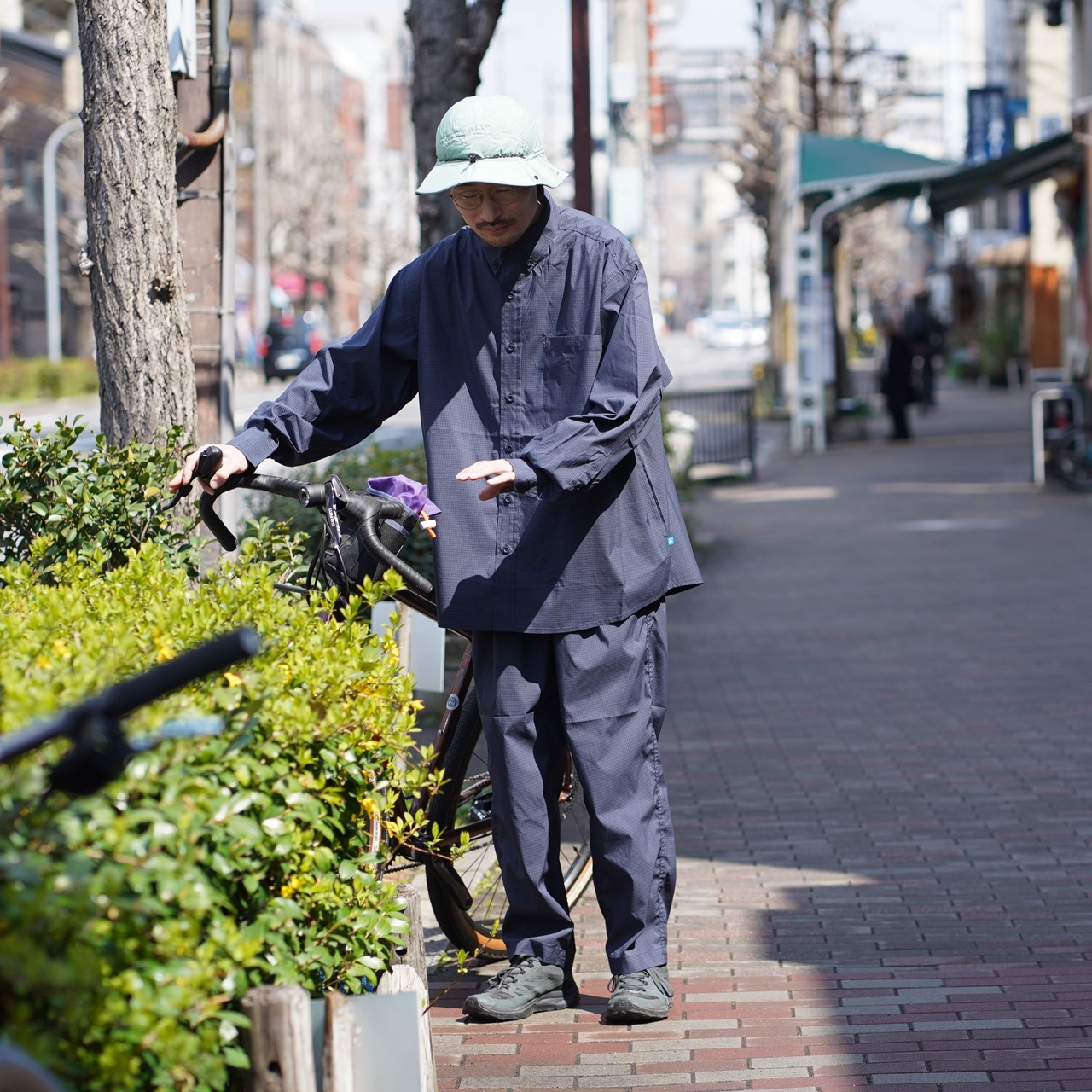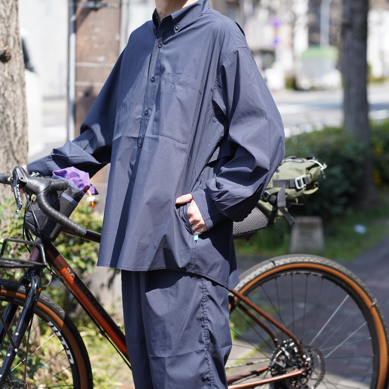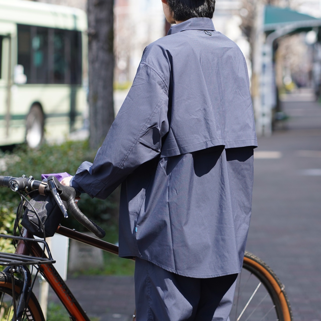 シャツはオーバーサイズシルエットでウィンドシェルがわりにがばっと羽織るのに最適。