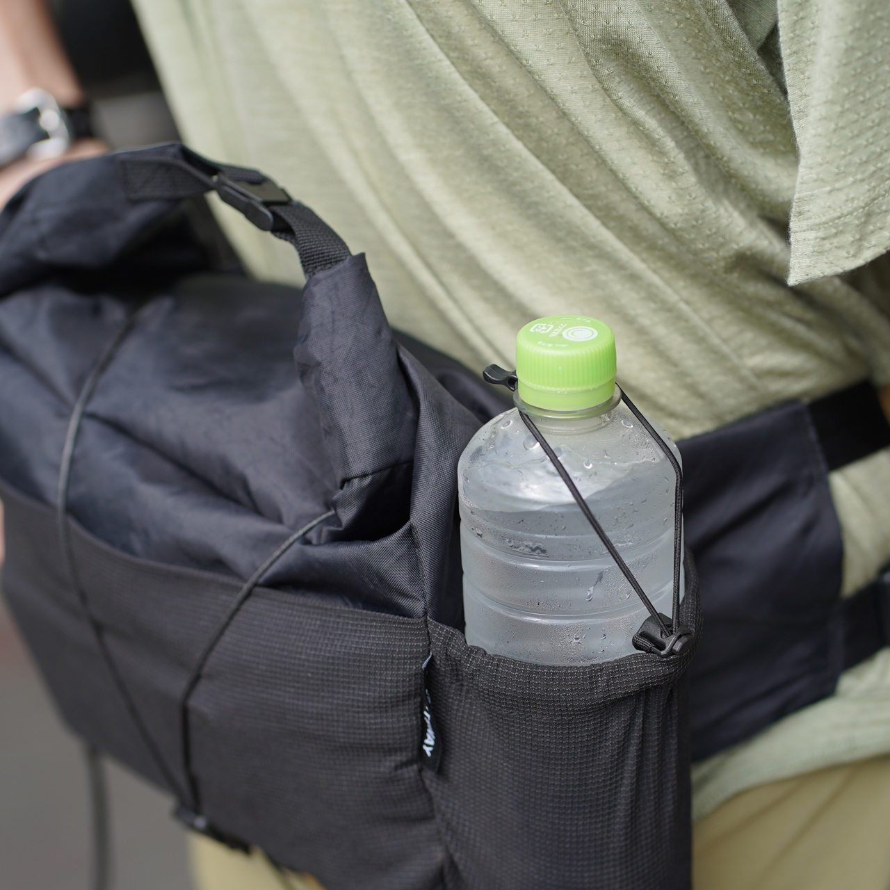 両サイドのボトルポケットはやや浅めですが、コンプレッション用のドローコードをボトルに引っ掛ければ脱落の恐れなし。