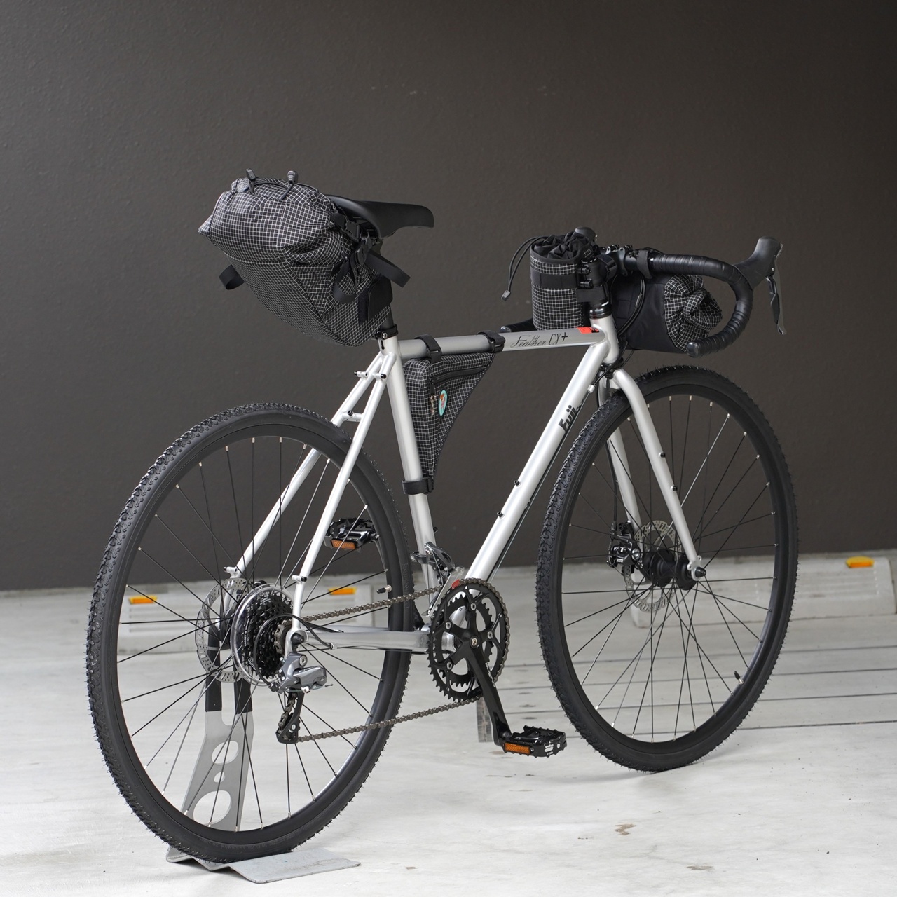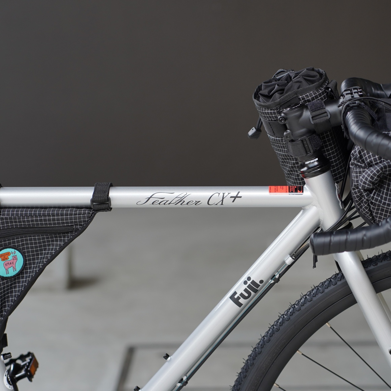 豊富なアイレットを備え、フロント/リアラック、フェンダー、センタースタンドなどなど、ほとんどの積載やオプションに対応する FEATHER CX+ を今回は敢えてバイクパッキングスタイルにしてみました。
