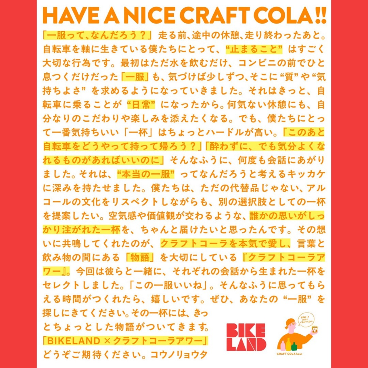 日本各地の銘柄を厳選した架空のクラフトコーラ屋チーム @craftcola_hour の活動に、自転車というフィルターを通したスペシャルセレクトなノンアルドリンクをご提供。