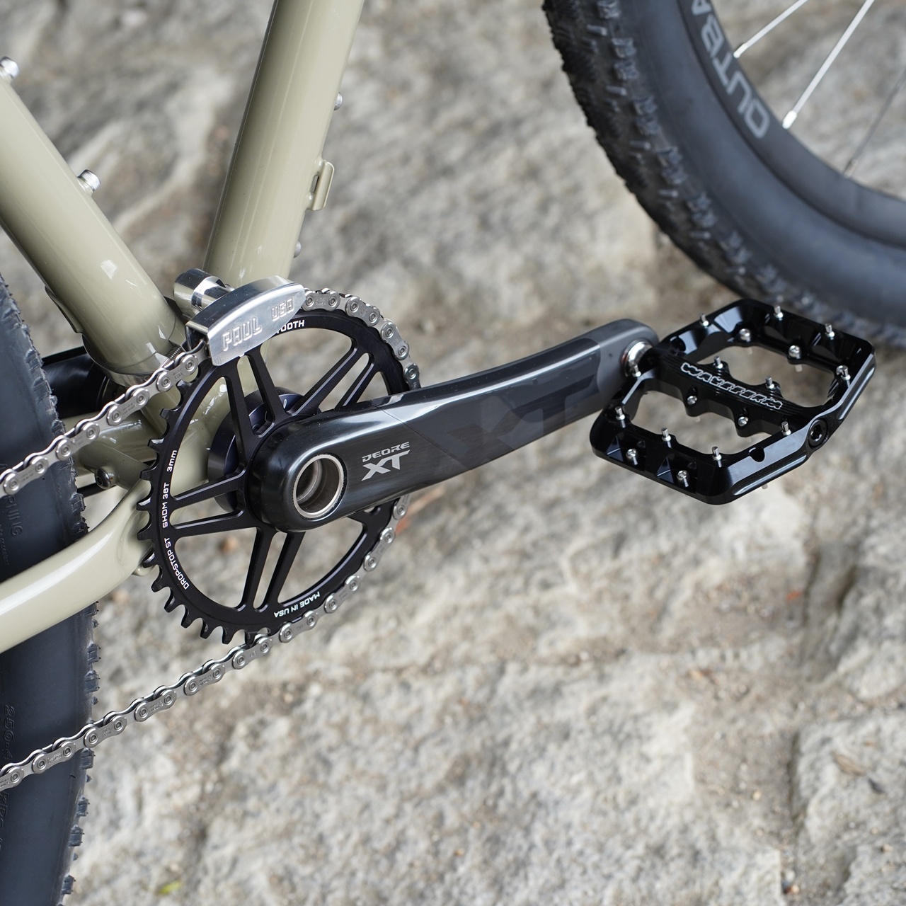 多段化等、今後の拡張性と実用性を考えた良い塩梅のシマノパーツとハンドルに合わせた Boone Technology のチタンスプロケットのバランス感覚。