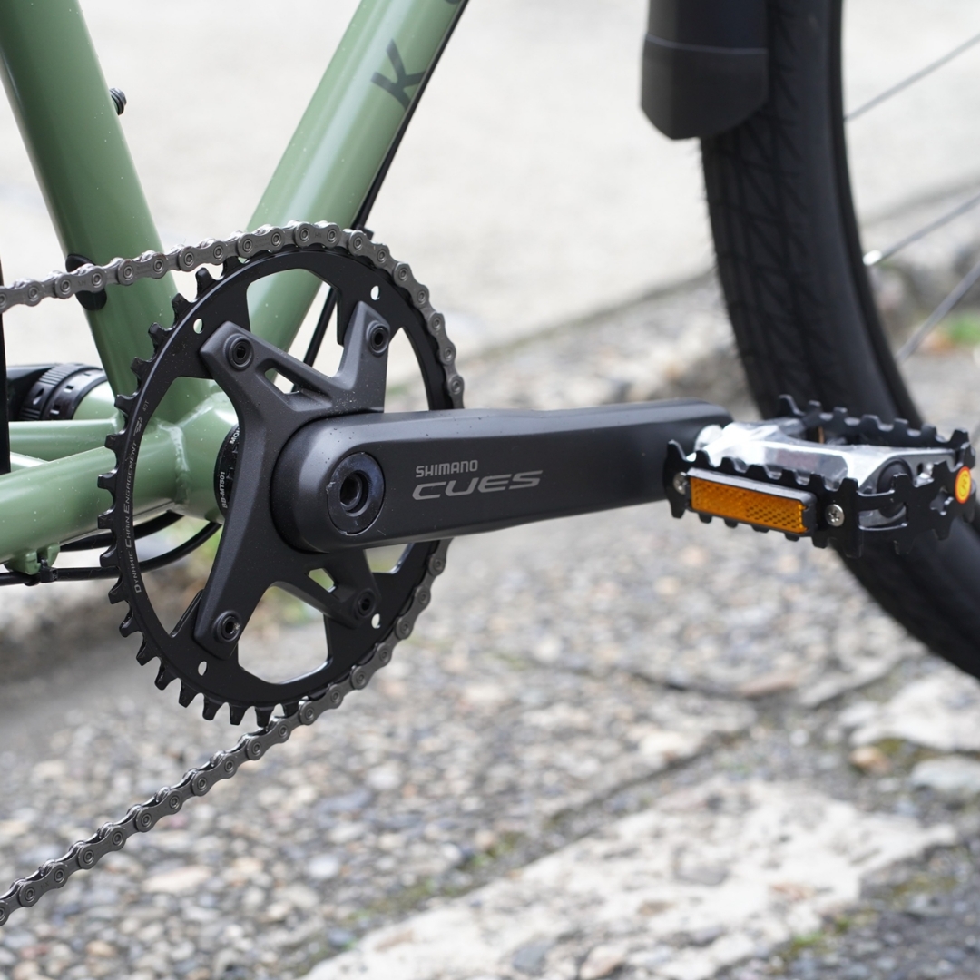 メインコンポはSHIMANO CUES 1x11S。クランクも2ピースタイプの高剛性なもの。