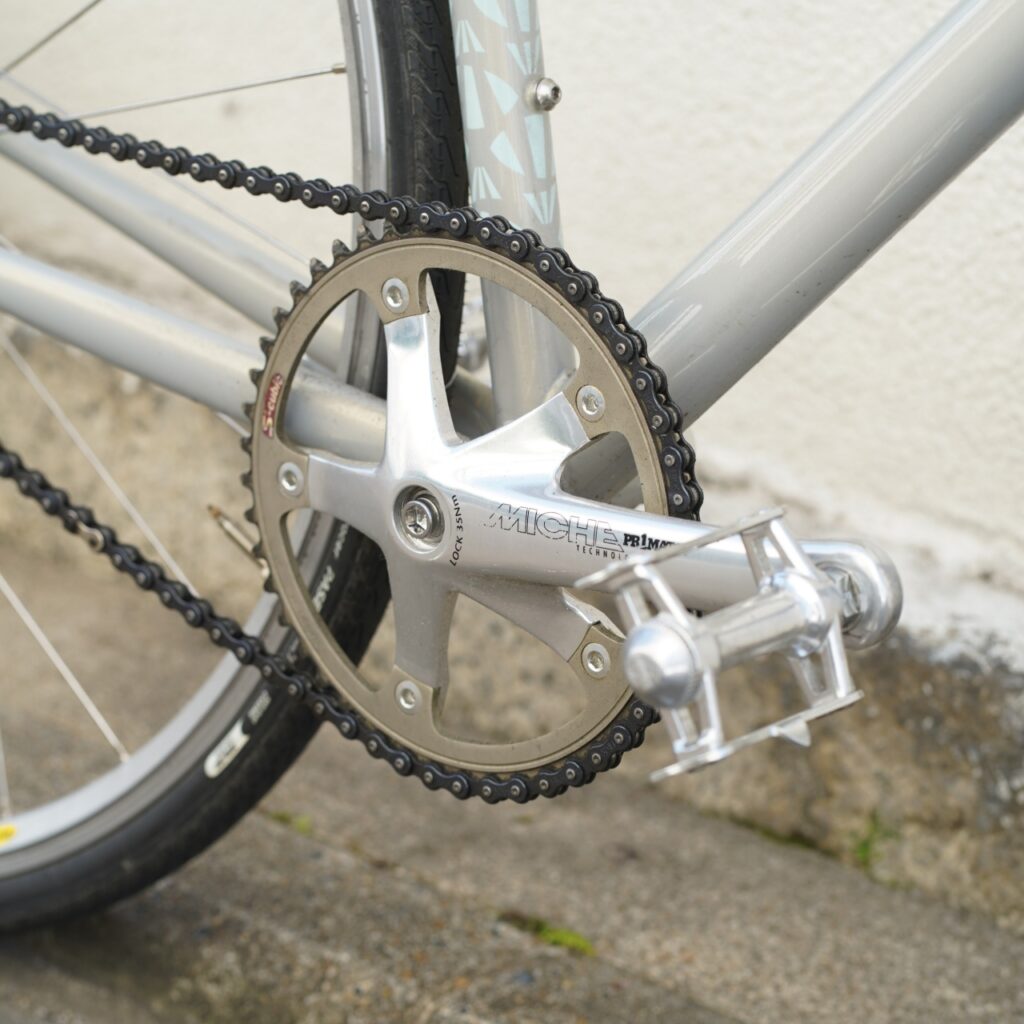 流麗なMICHEクランクにSUGINOのチタンゴールドアルマイトカラーのチェーンリングもお気に入りポイント。